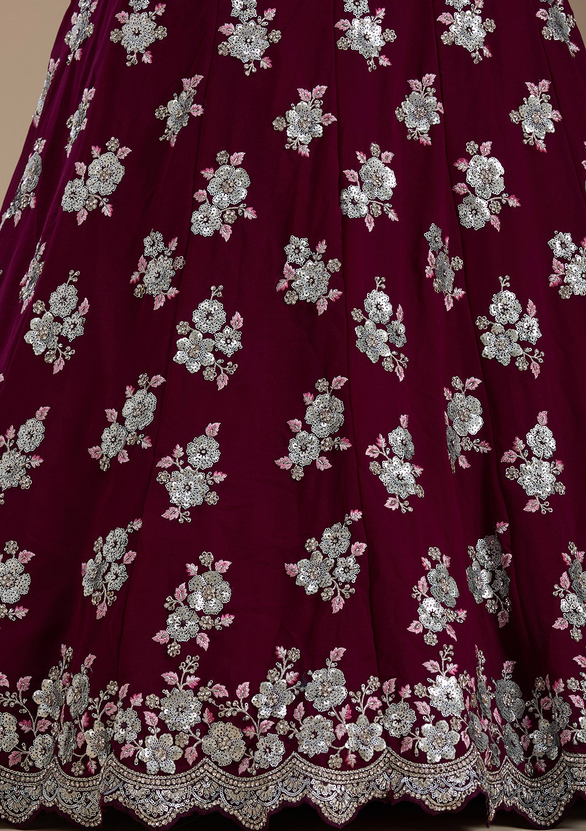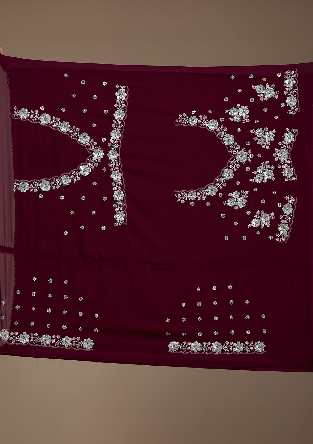 Unleash your vibrant spirit in Koskii's breathtaking burgundy georgette lehenga, adorned with dazzling sequin embroidery that complements every twist and twirl! Crafted from the finest georgette, this lehenga promises a silhouette that swirls elegantly with your every move, ensuring you shine with a playful yet sophisticated allure. Perfect for those gala evenings where turning heads is just as important as celebrating in style!