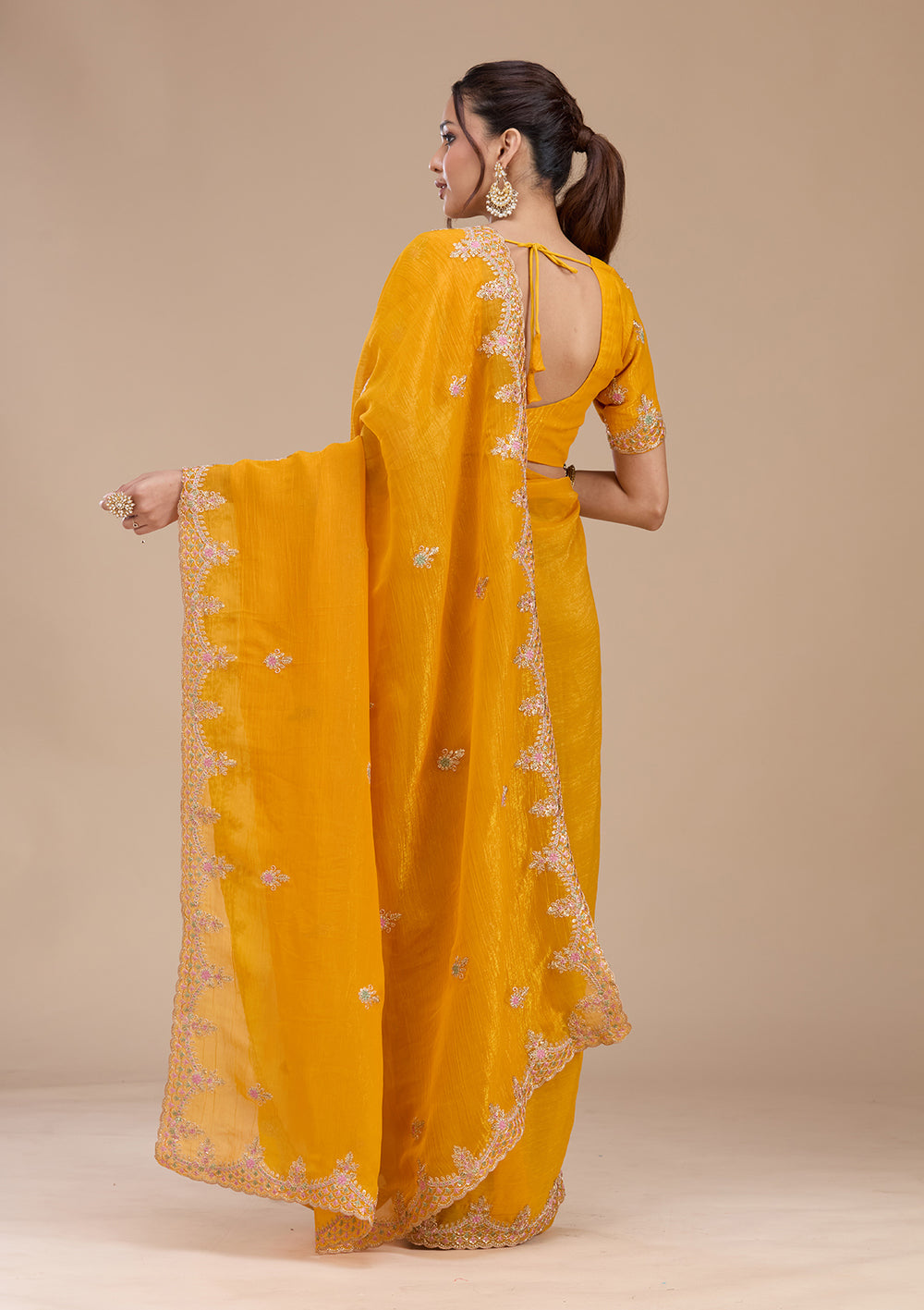 - Yellow Organza Saree: An Organza Saree in yellow looks breezy and would be the perfect outfit for a lunch date with your friends.
