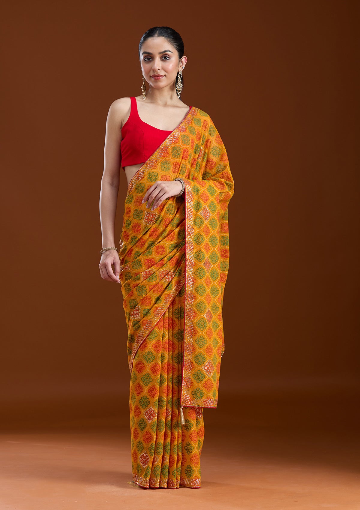 Mustard Saree in Georgette fabric. The Saree is elevated with Stonework (Gold) embroidery. It comes with an Unstitched blouse. Comes with the Koskii promise of premium quality.