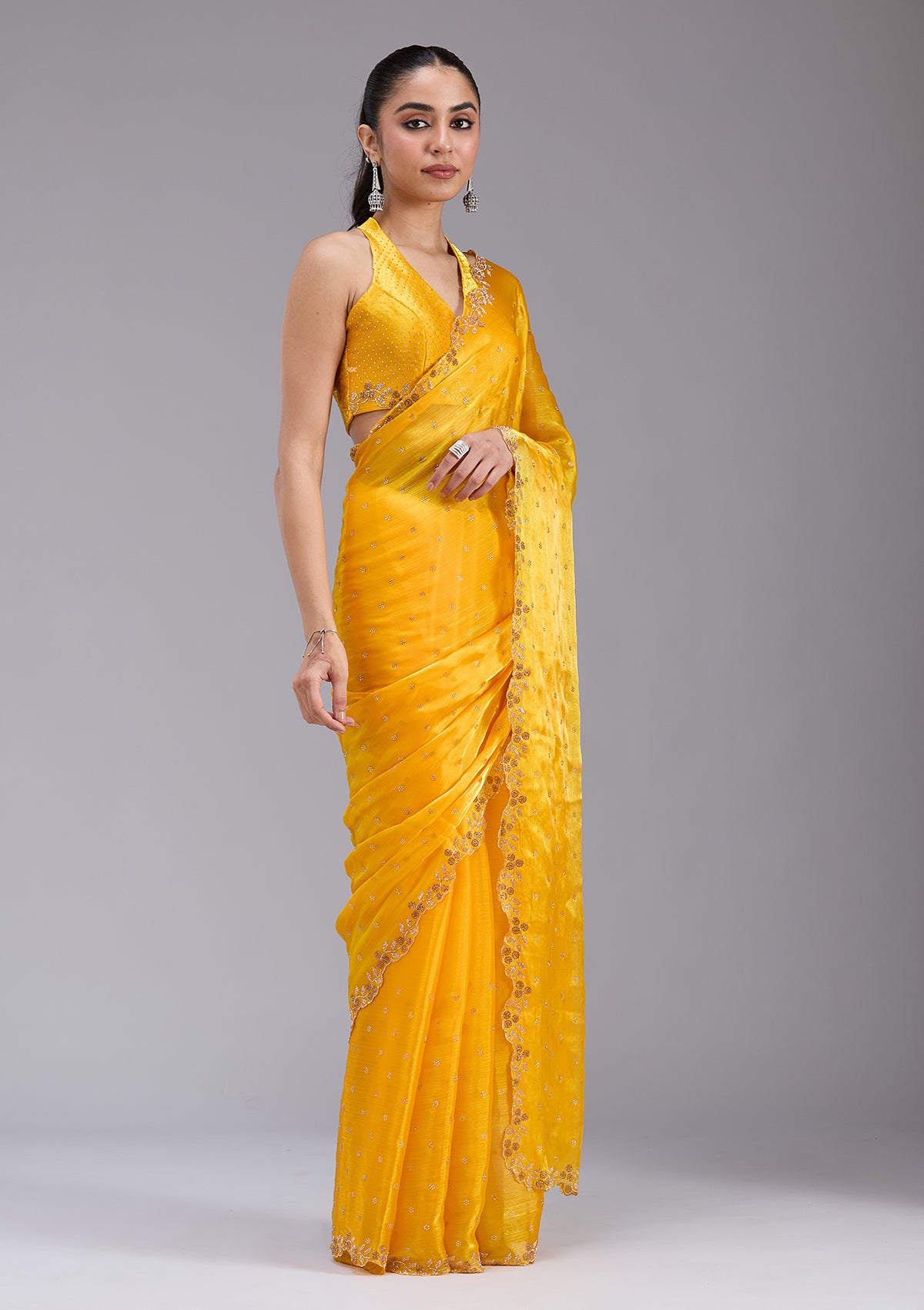 Mustard Saree in Tissue fabric. The Saree is elevated with Stonework (Gold) embroidery. It comes with an Unstitched blouse. Comes with the Koskii promise of premium quality.