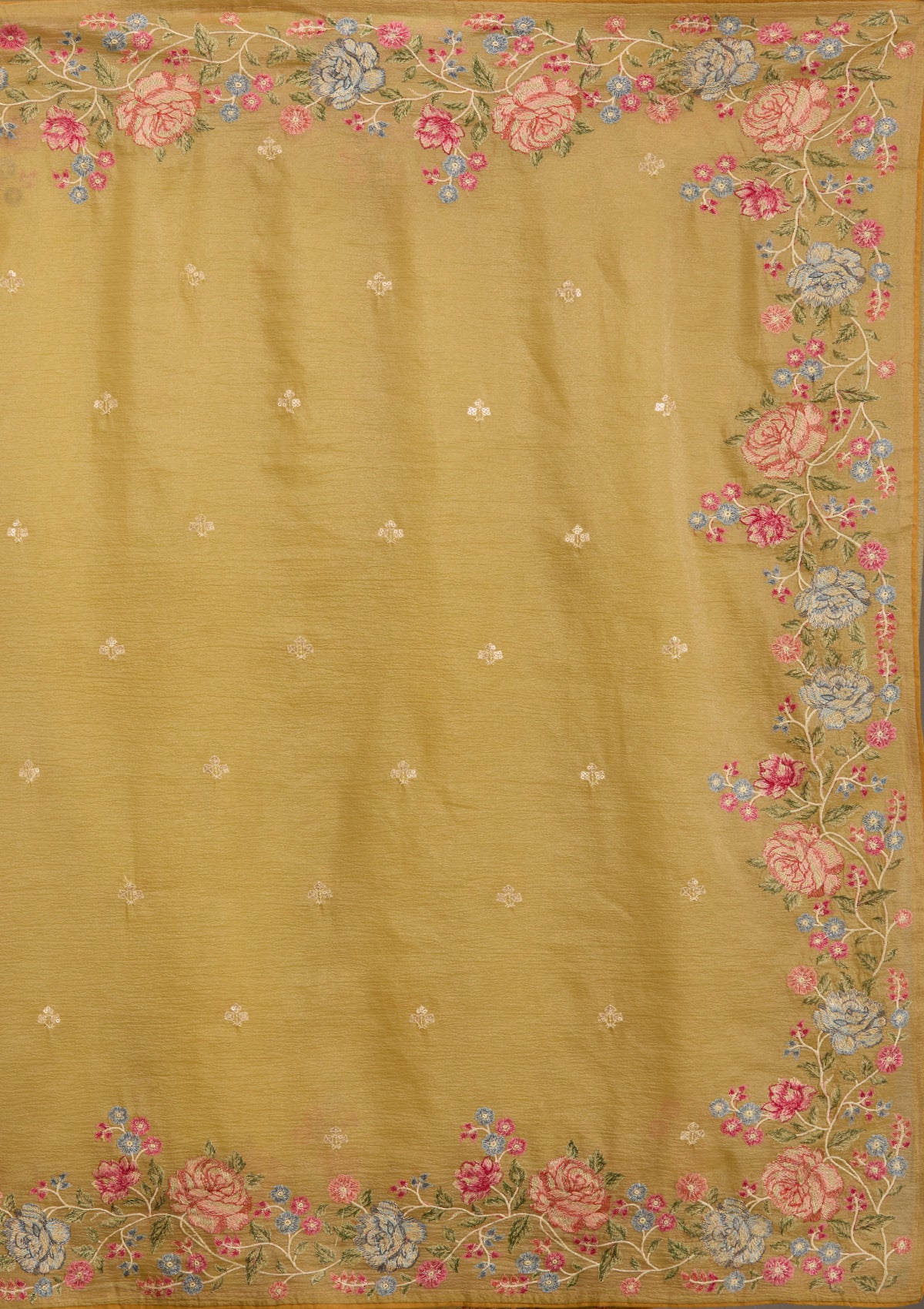 Unwrap your sparkle with Koskii's Gold Tissue Saree, where vibrant meets vintage! This saree flourishes with enchanting pink floral threadwork over a glimmering gold tissue fabric, offering an elegant silhouette that dances between tradition and contemporary chic. Perfect for making bold, beautiful statements, it is your go-to masterpiece for turning heads and capturing hearts at any upscale event.