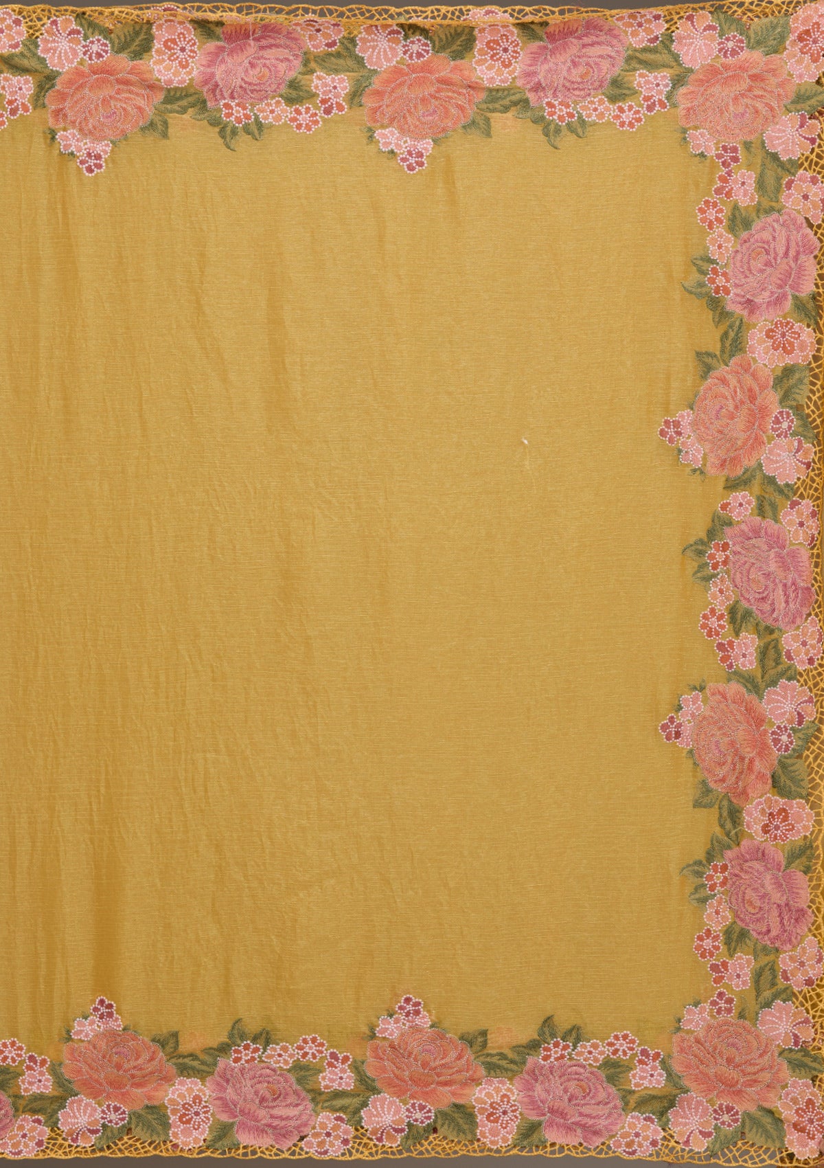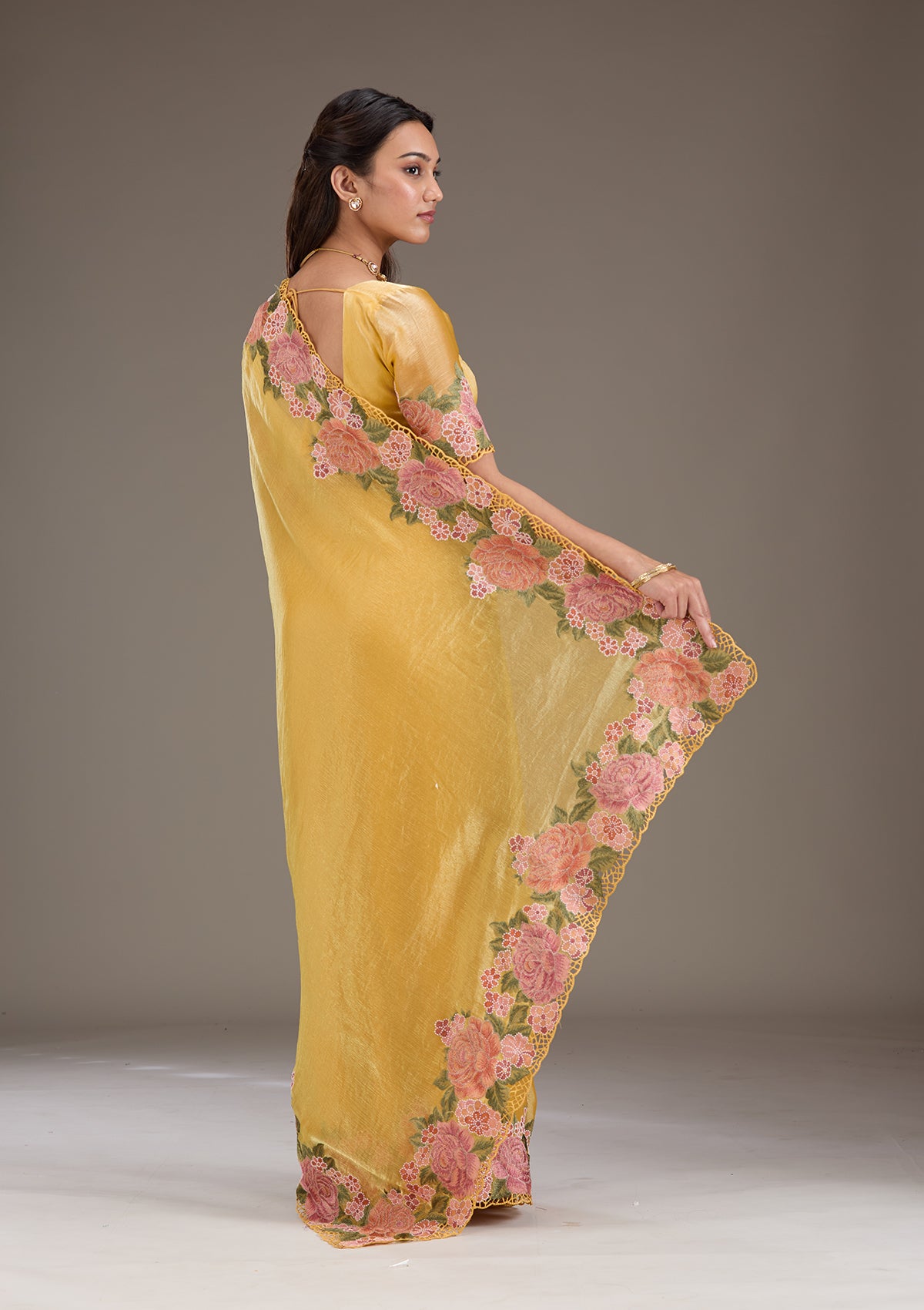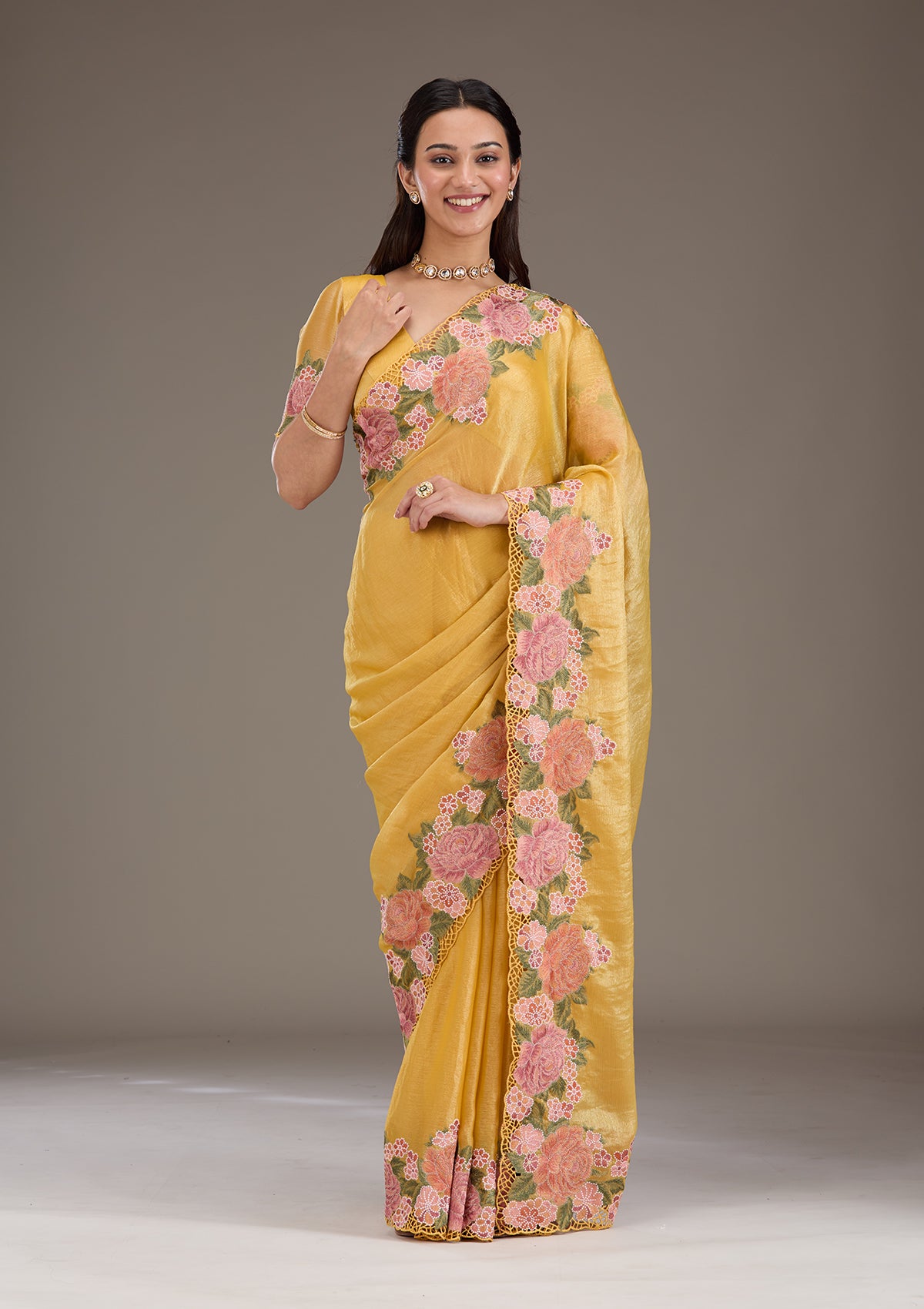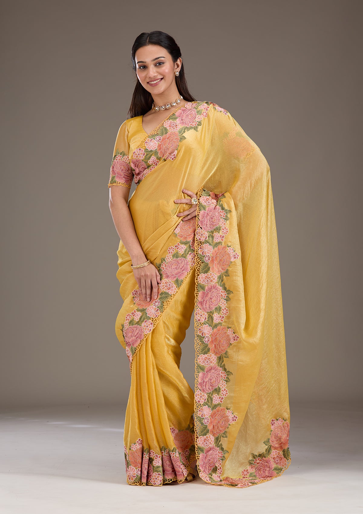 Step into the spotlight with Koskii’s golden tissue saree, where elegance meets excitement! This masterpiece features intricate cutwork embroidery in a cascade of lush pink blooms, adding a whimsical touch to the luxurious golden hue. Perfect for those who dare to dazzle, this saree is your ticket to becoming the evening's enchanting centerpiece.
