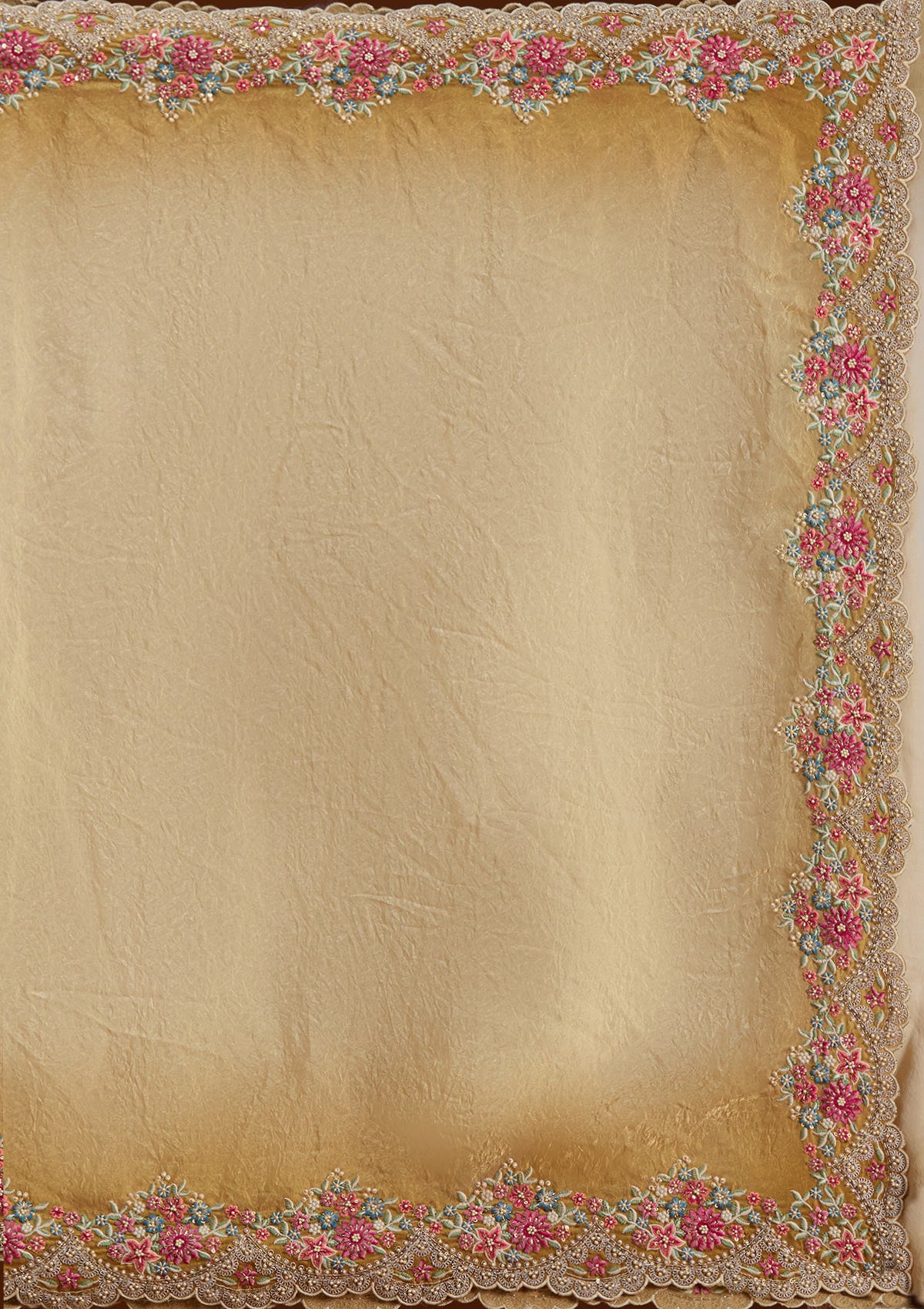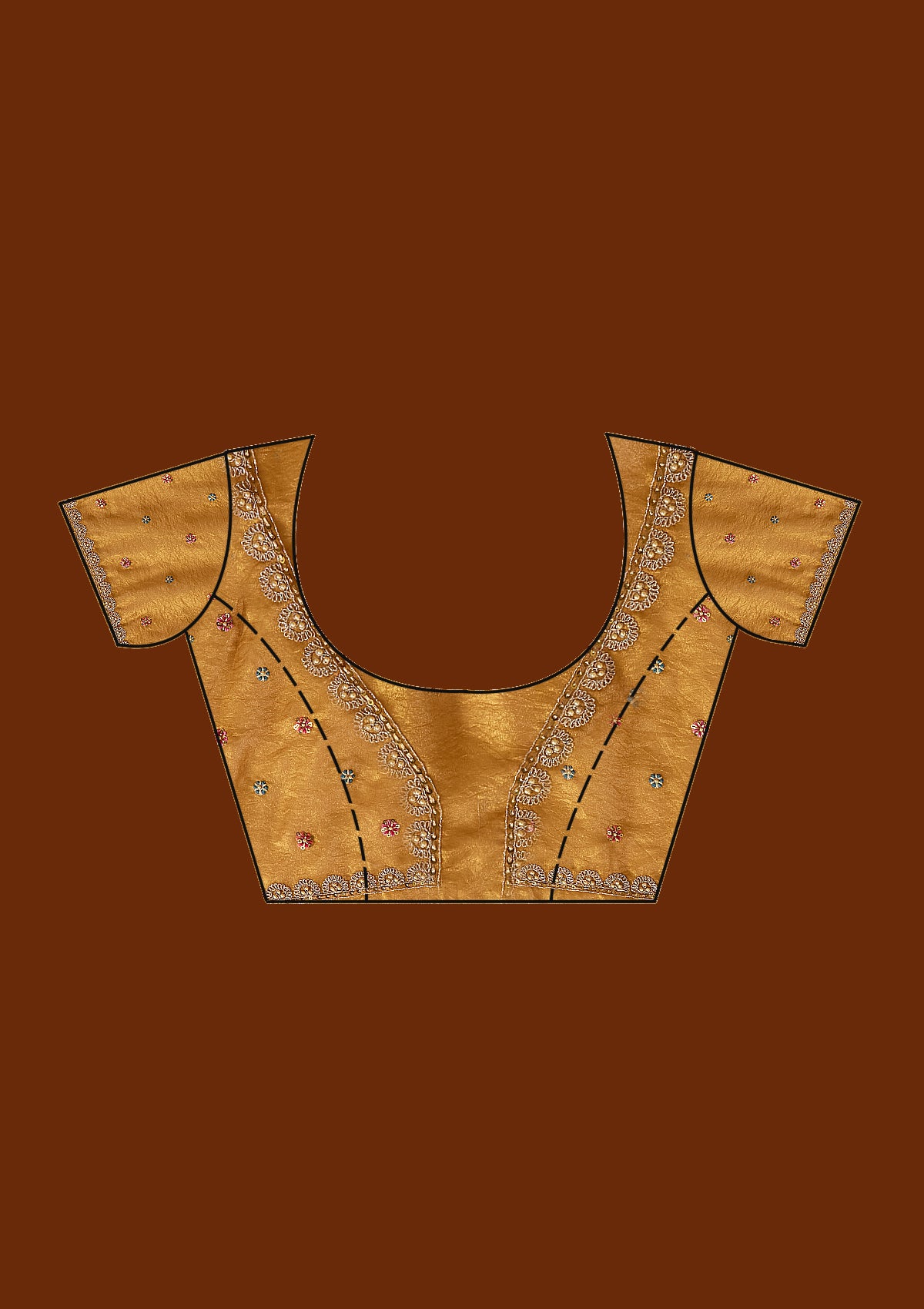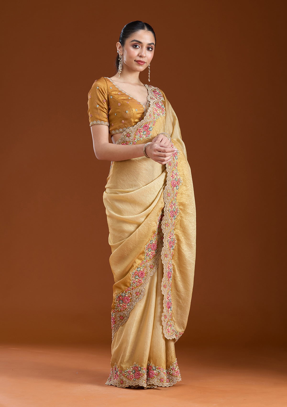 Mustard Saree in Tissue fabric. The Saree is elevated with Threadwork embroidery. It comes with an Unstitched blouse. Comes with the Koskii promise of premium quality.