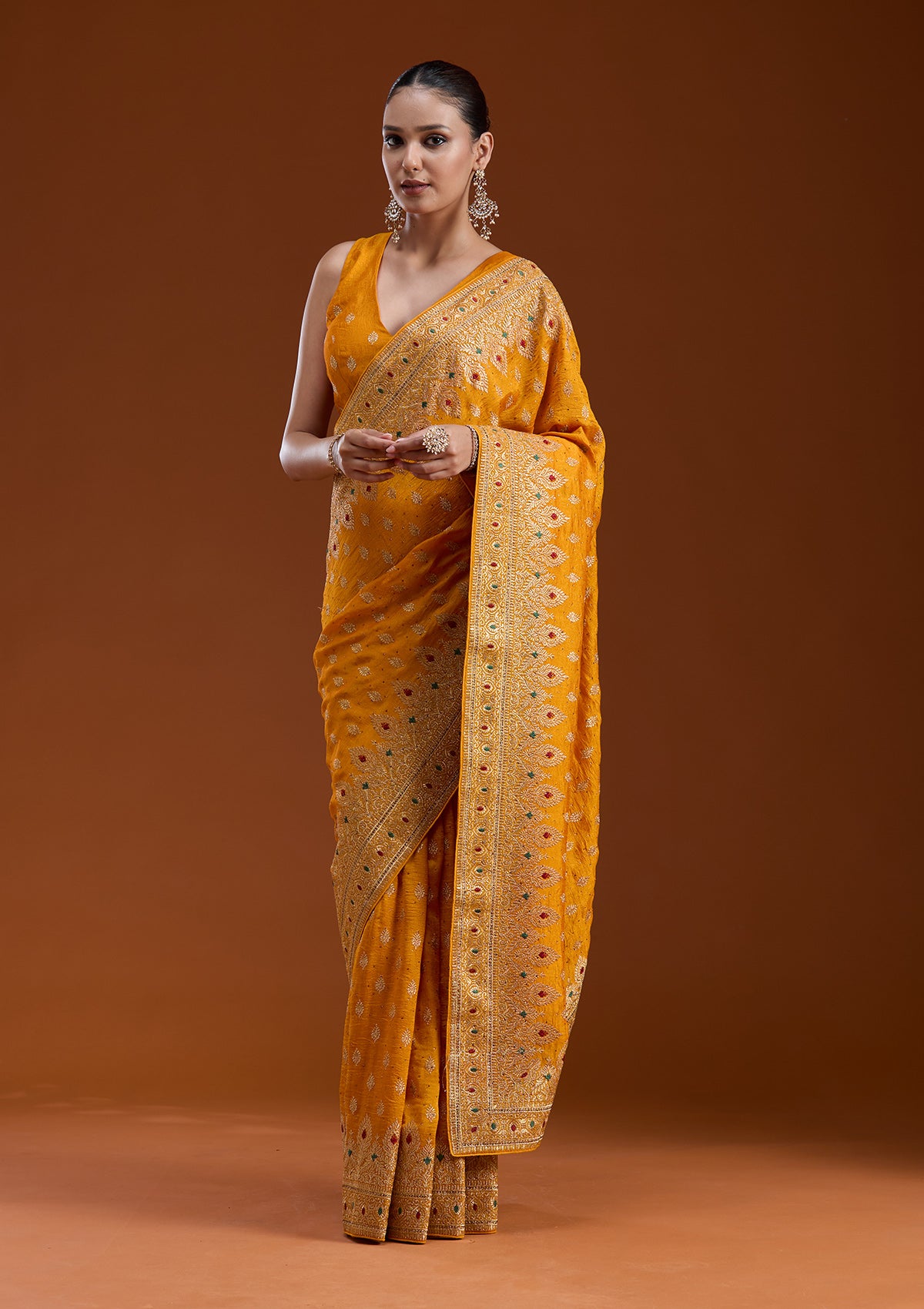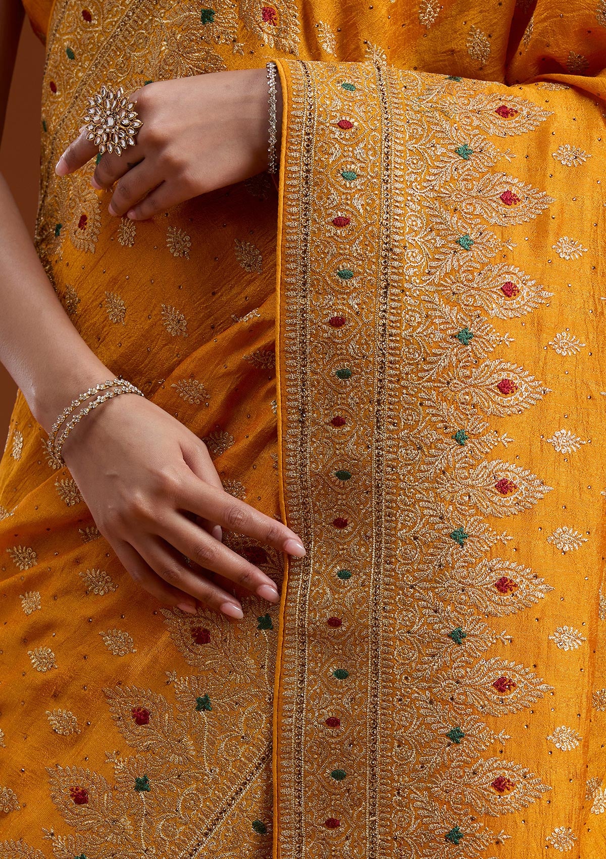 Mustard Saree in Soft Raw Silk fabric. The Saree is elevated with Zariwork (Gold) embroidery. It comes with an Unstitched blouse. Comes with the Koskii promise of premium quality.