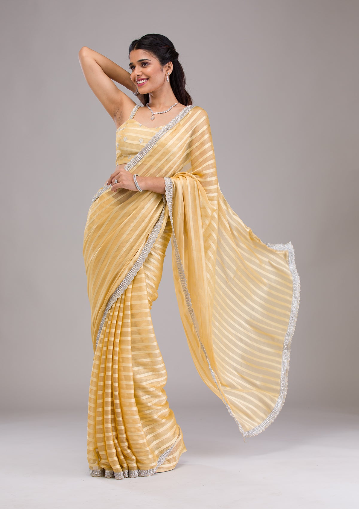 Yellow Saree in Semi Crepe fabric. The Saree is elevated with Stonework embroidery. It comes with an Unstitched blouse. Comes with the Koskii promise of premium quality.
