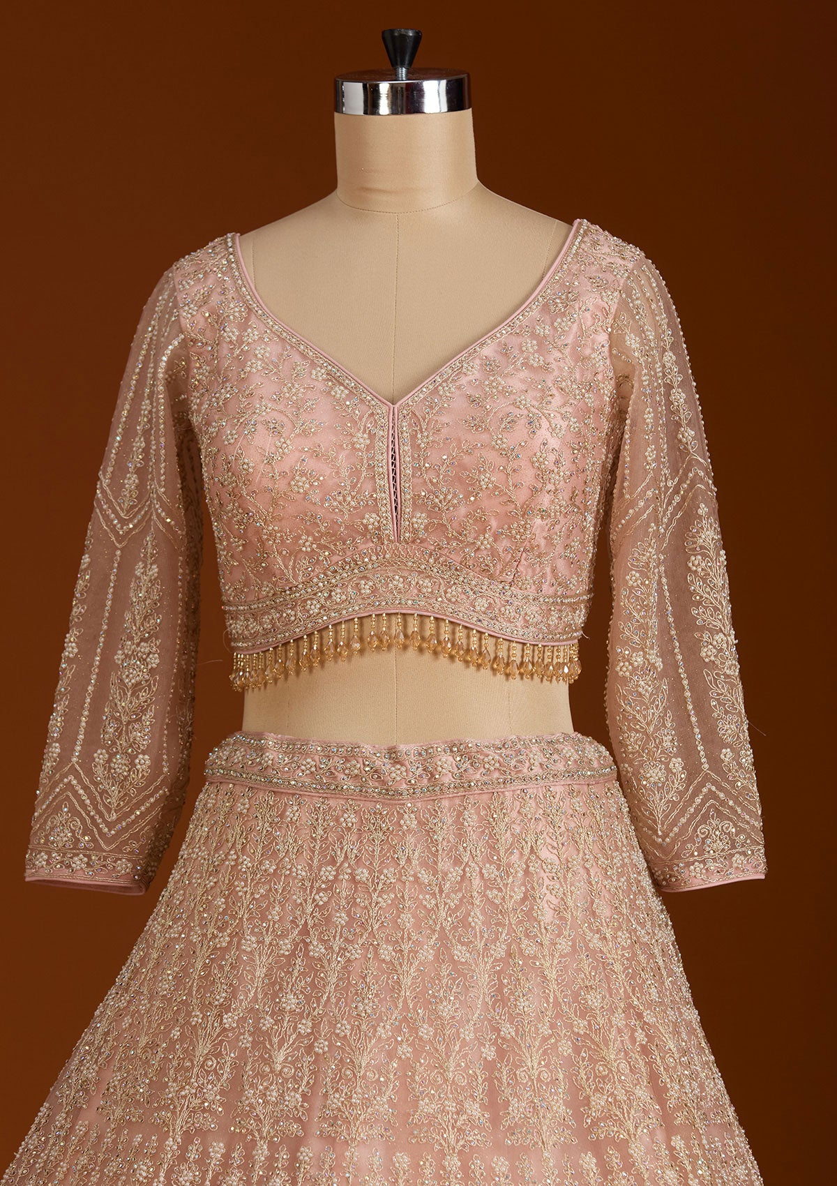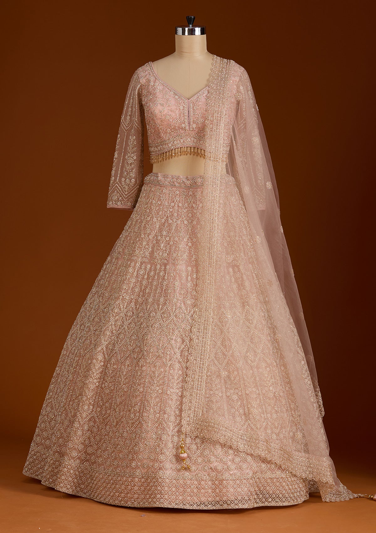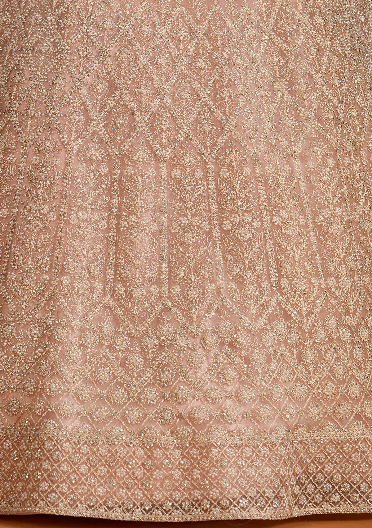 Step into a realm of enchantment with Koskii's Peach Lehenga, a masterpiece crafted from luxurious net fabric and adorned with exquisite silver stonework. This piece epitomizes elegance, boasting a silhouette that radiates poise and glamour. Perfect for those who love to shine, the lehenga's vibrant detailing and playful flair make it a stellar choice for any grand celebration or festive occasion.