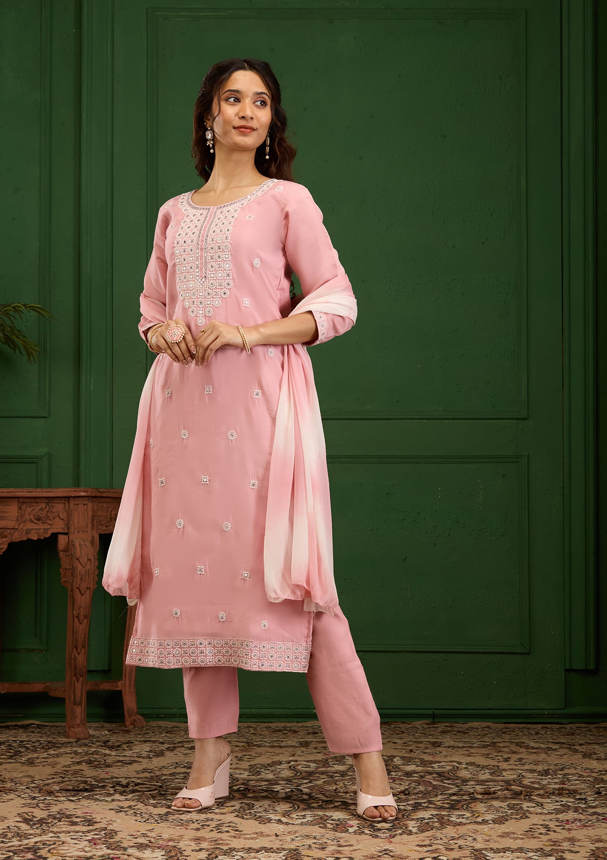 Step into a world of style and grace with Koskii's Pink Crepe Salwar Suit, a readymade treasure embroidered with exquisite threadwork. This vibrant ensemble blends traditional charm with a modern silhouette, making it a perfect pick for any event where elegance is a must. Revel in the luxurious feel of crepe fabric while you make a dazzling statement with every twirl and step!.