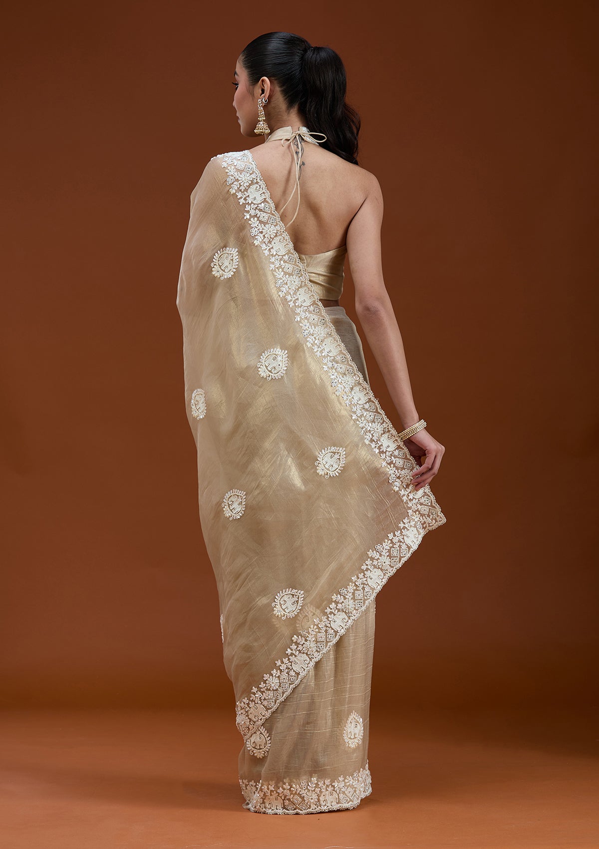Beige Saree in Tissue fabric. The Saree is elevated with Pearlwork embroidery. It comes with an Unstitched blouse. Comes with the Koskii promise of premium quality.