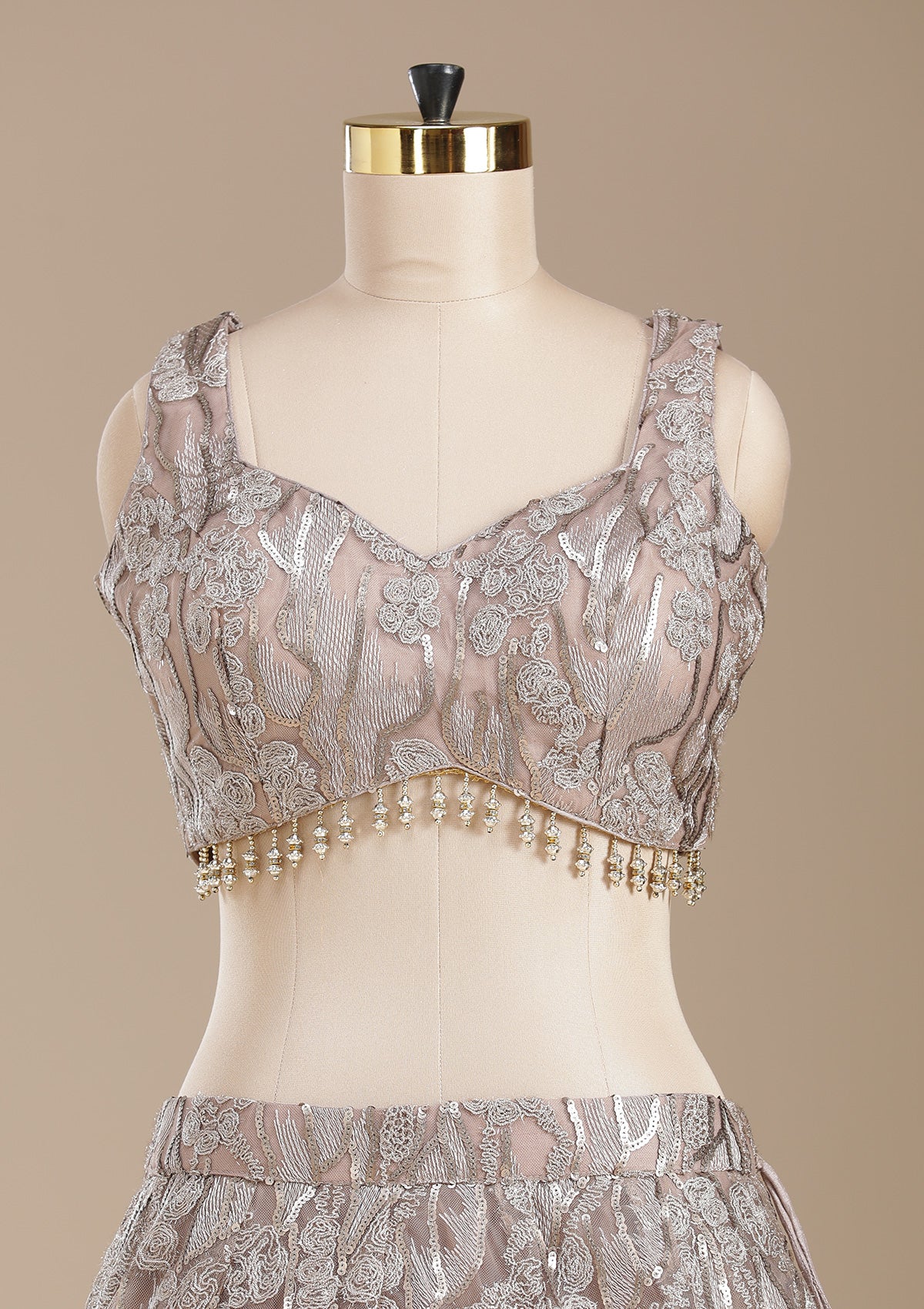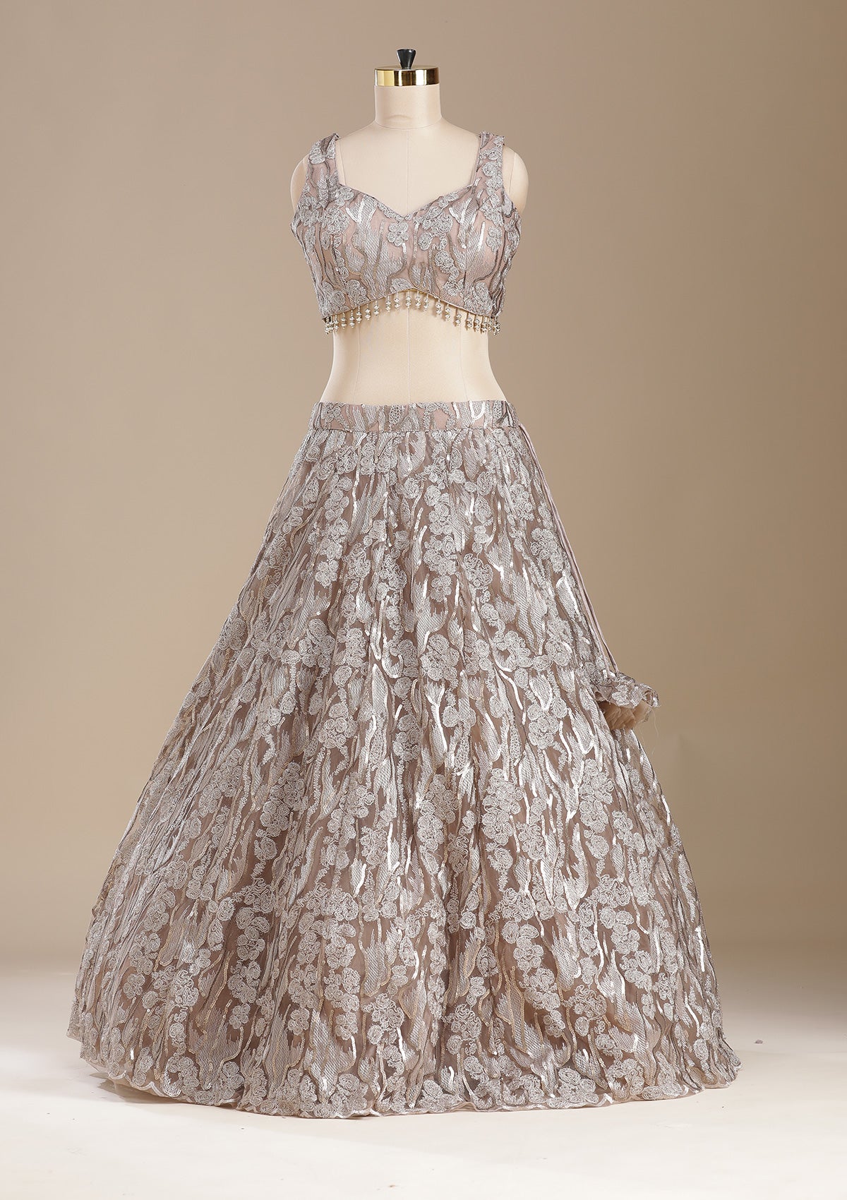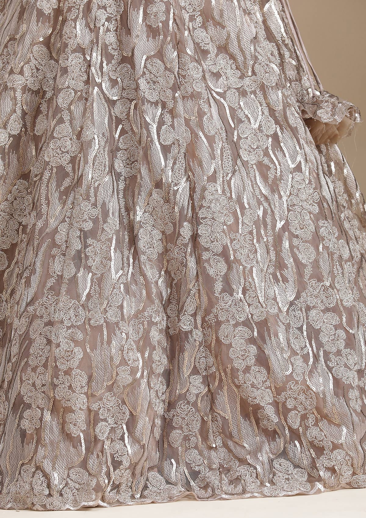 Brown Readymade Lehenga in Net fabric. The Lehenga is embellished with Threadwork embroidery. Accompanied with an Readymade blouse and dupatta. Comes with the Koskii promise of premium quality.