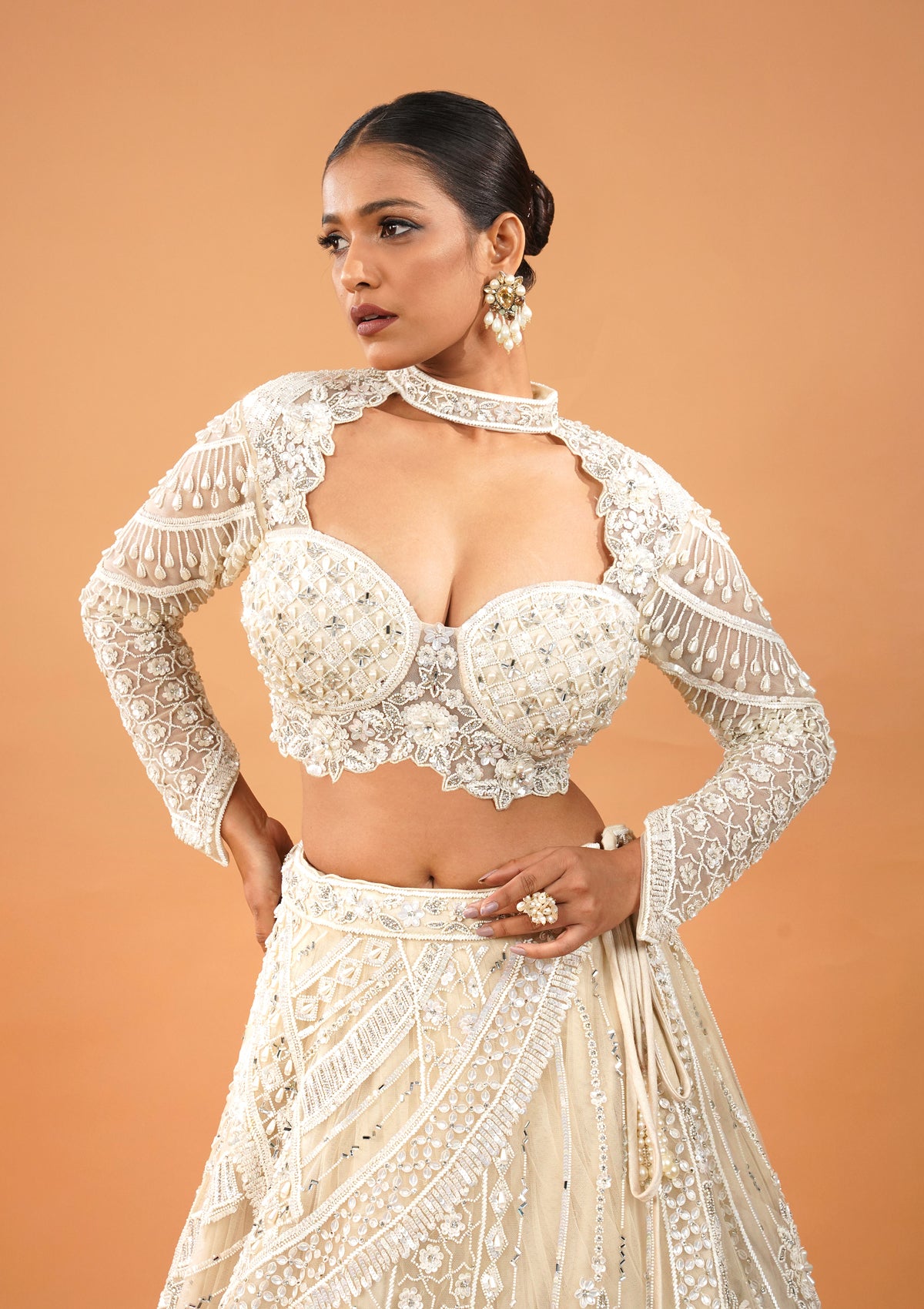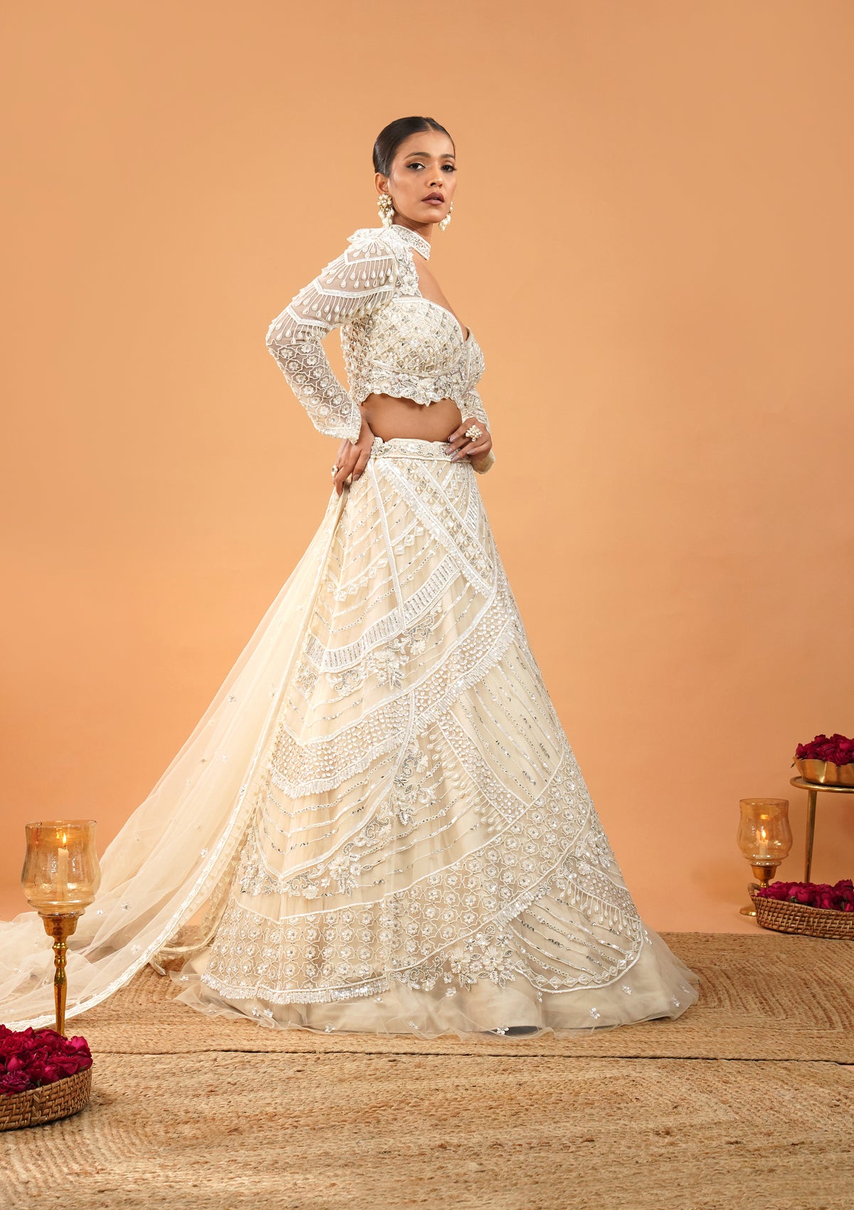 Step into the spotlight with Koskii's radiant White Net Lehenga, where every twirl is a shimmer of sophistication! This masterpiece is intricately adorned with lustrous pearlwork, casting a spell of elegance on your special day. Crafted from airy net fabric, it promises a magical blend of comfort and glamour, perfect for the bride who embraces both tradition and trends with open arms and a playful spirit.