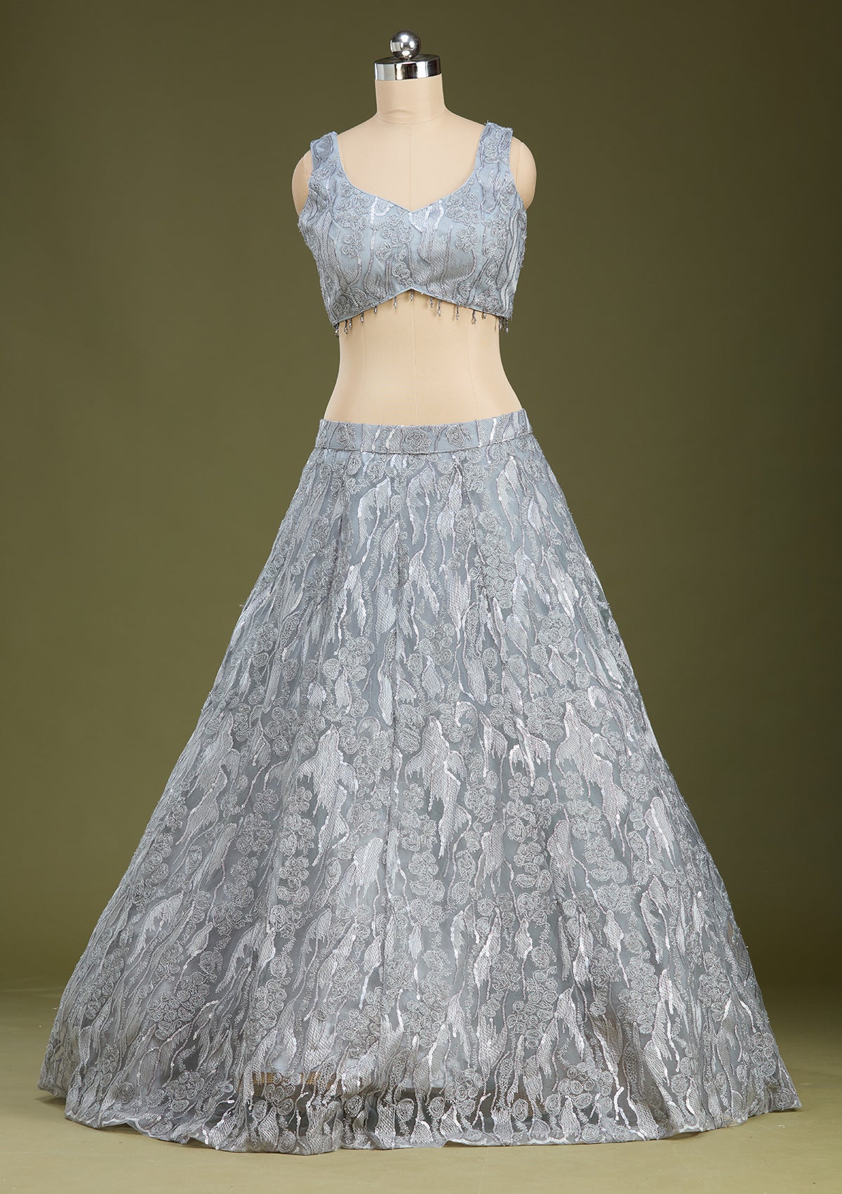 Grey Readymade Lehenga in Net fabric. The Lehenga is embellished with Threadwork embroidery. Accompanied with an Readymade blouse and dupatta. Comes with the Koskii promise of premium quality.