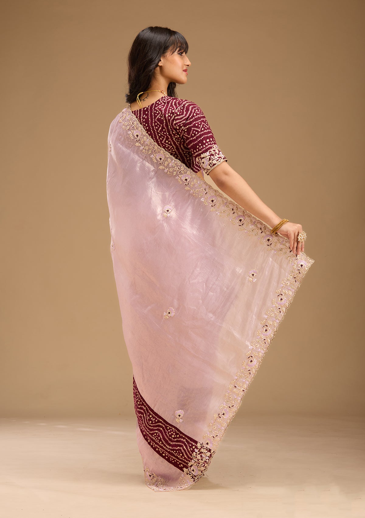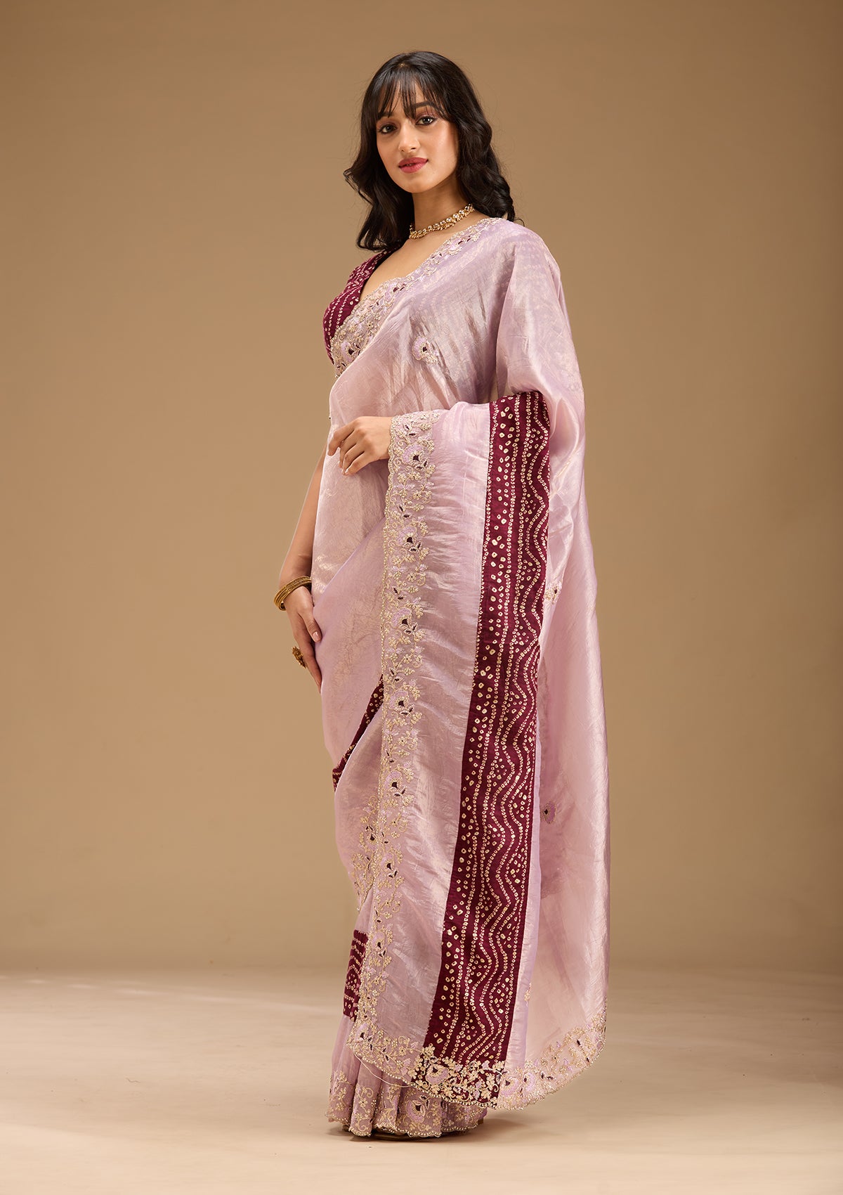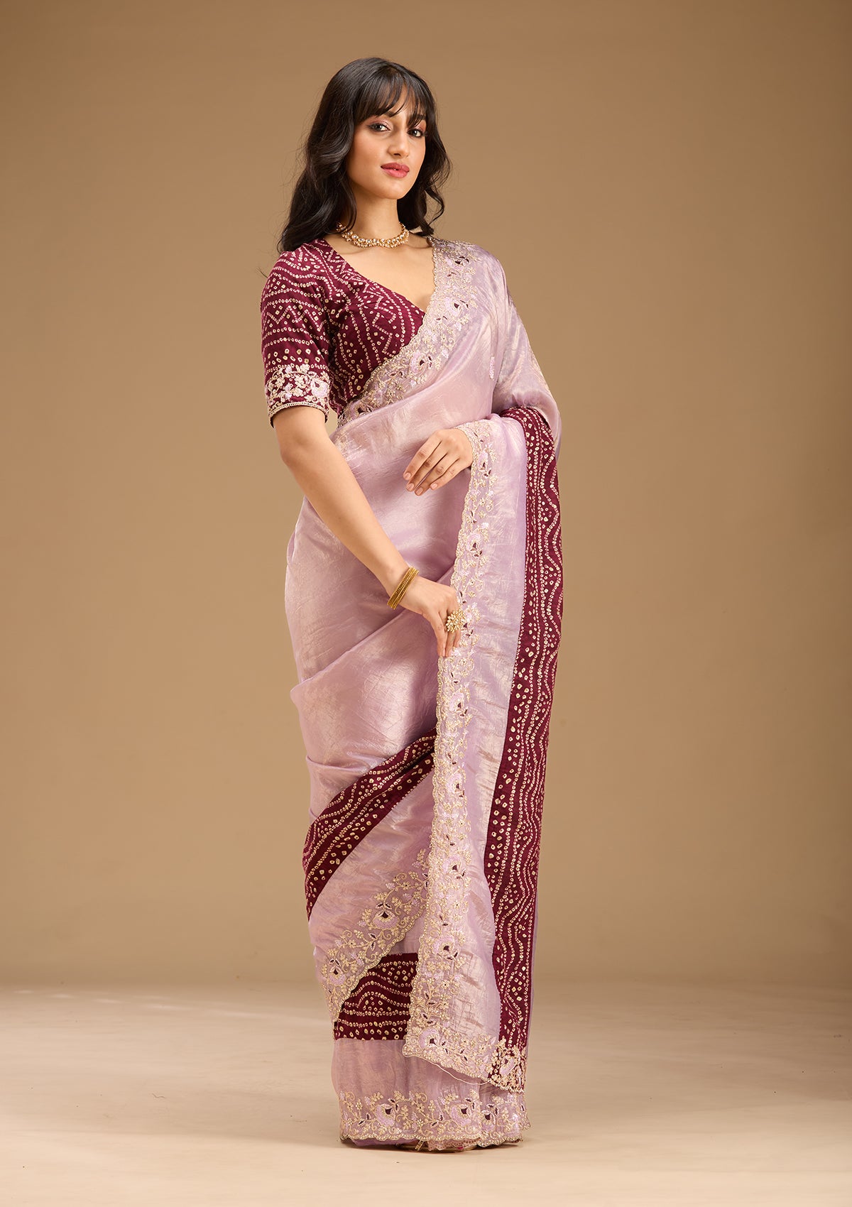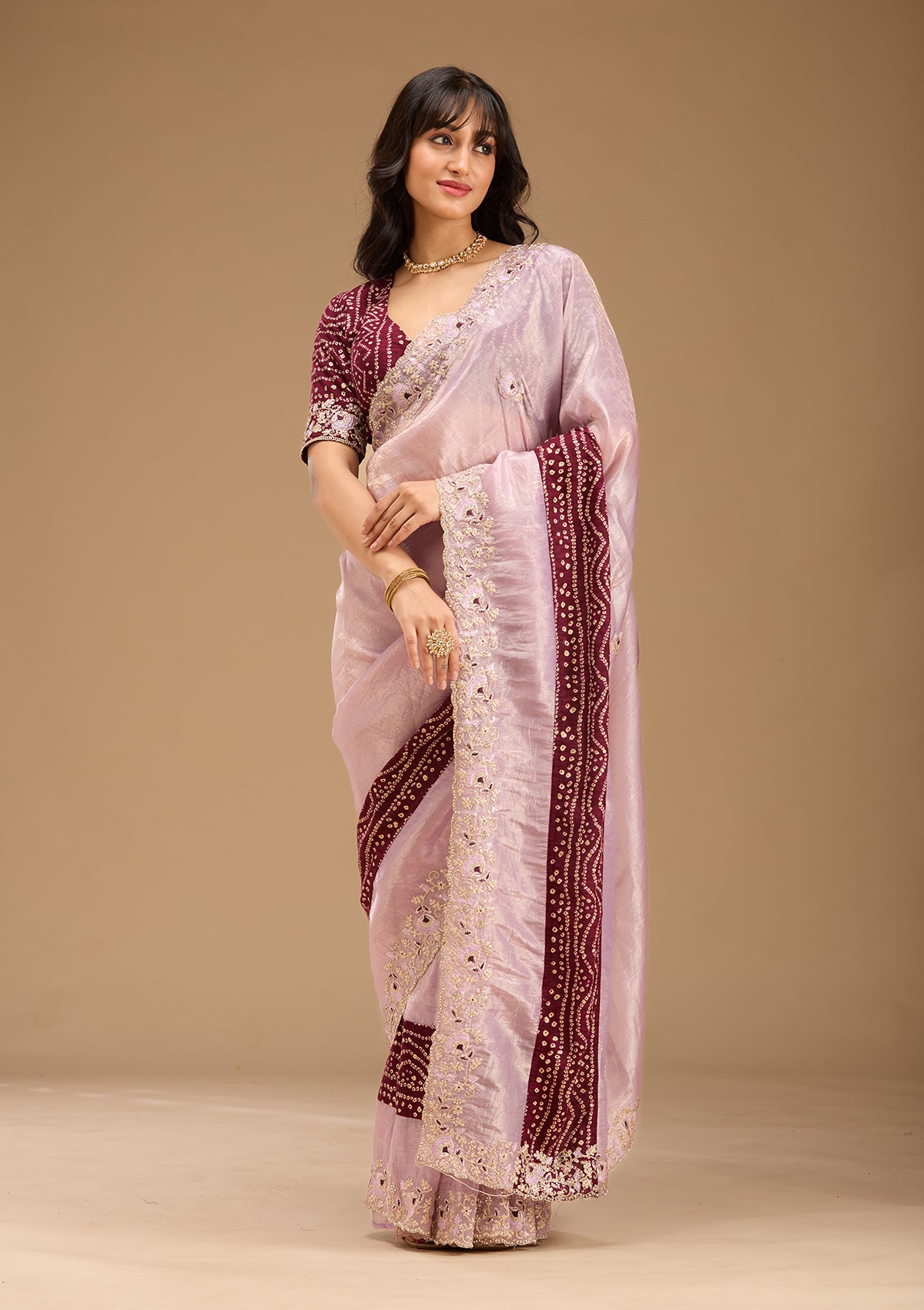 Lavender Saree in Tissue fabric. The Saree is elevated with Zariwork (Gold) embroidery. It comes with an Unstitched blouse. Comes with the Koskii promise of premium quality.