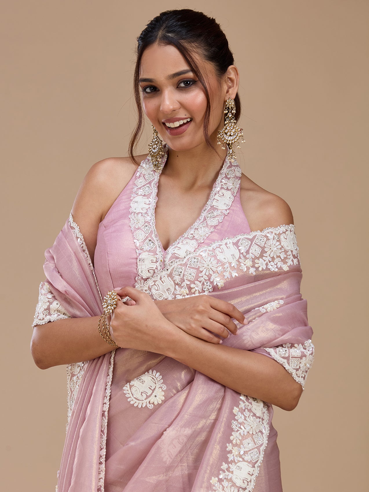 Mauve Saree in Tissue fabric. The Saree is elevated with Pearlwork embroidery. It comes with an Unstitched blouse. Comes with the Koskii promise of premium quality.