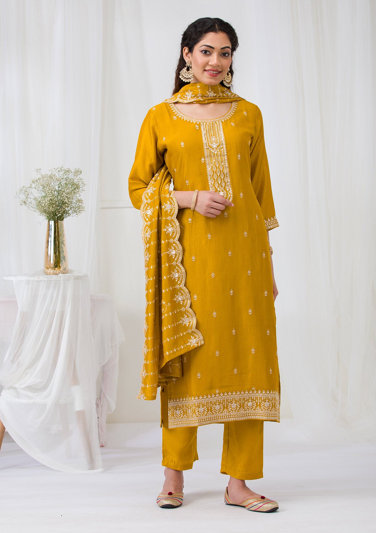 Mustard Sequins Raw Silk Readymade Salwar Suit