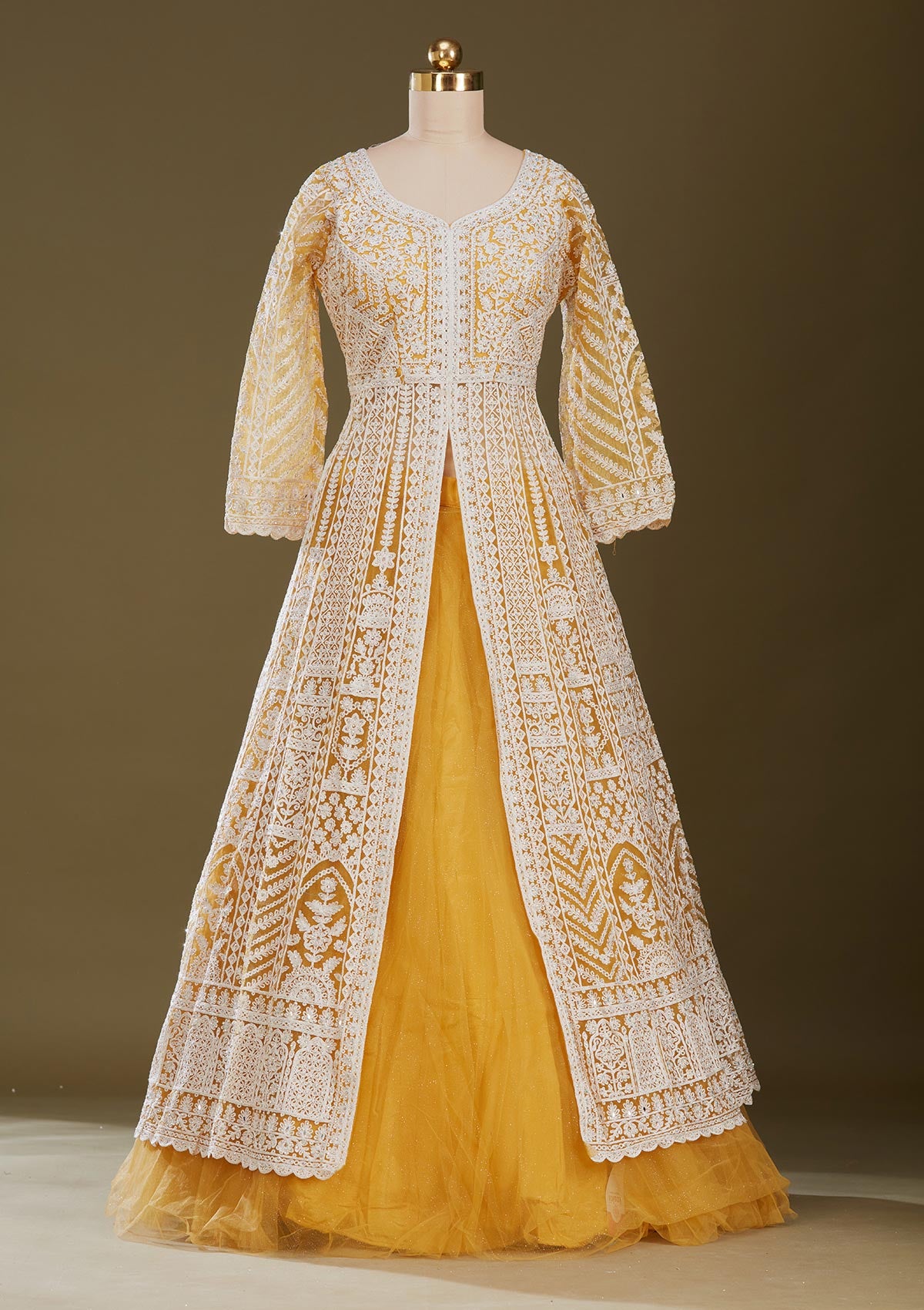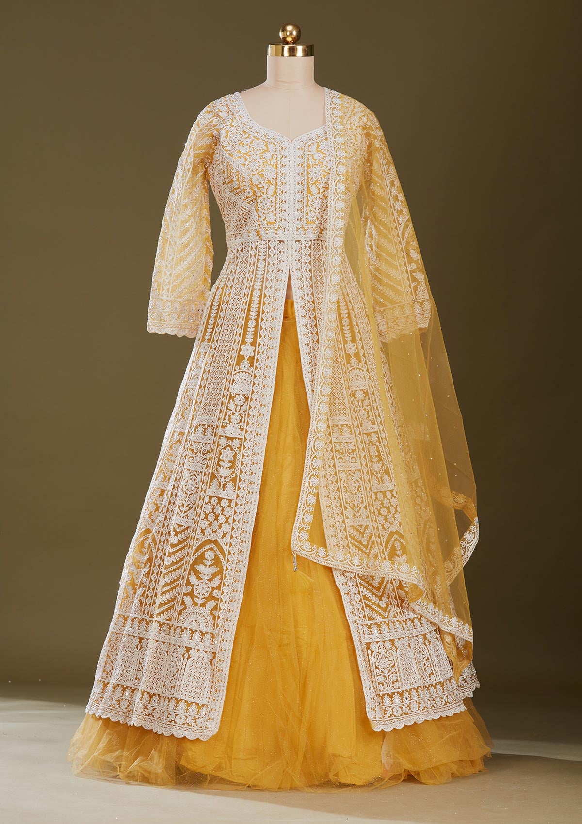 Mustard Yellow Threadwork Net Readymade Lehenga
