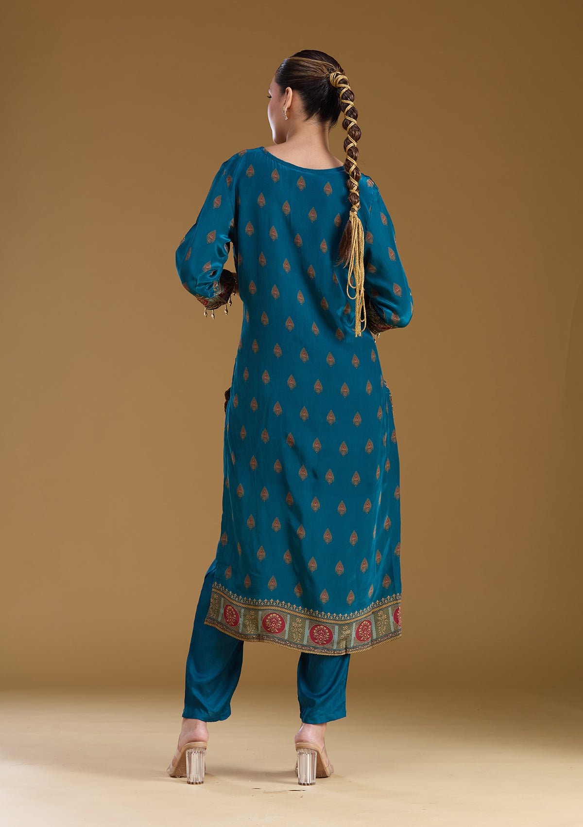 Peacock Blue Salwar_RM in Soft Raw Silk fabric. The Salwar_RM is embellished with Threadwork embroidery. Accompanied with a bottom and dupatta. Comes with the Koskii promise of premium quality.