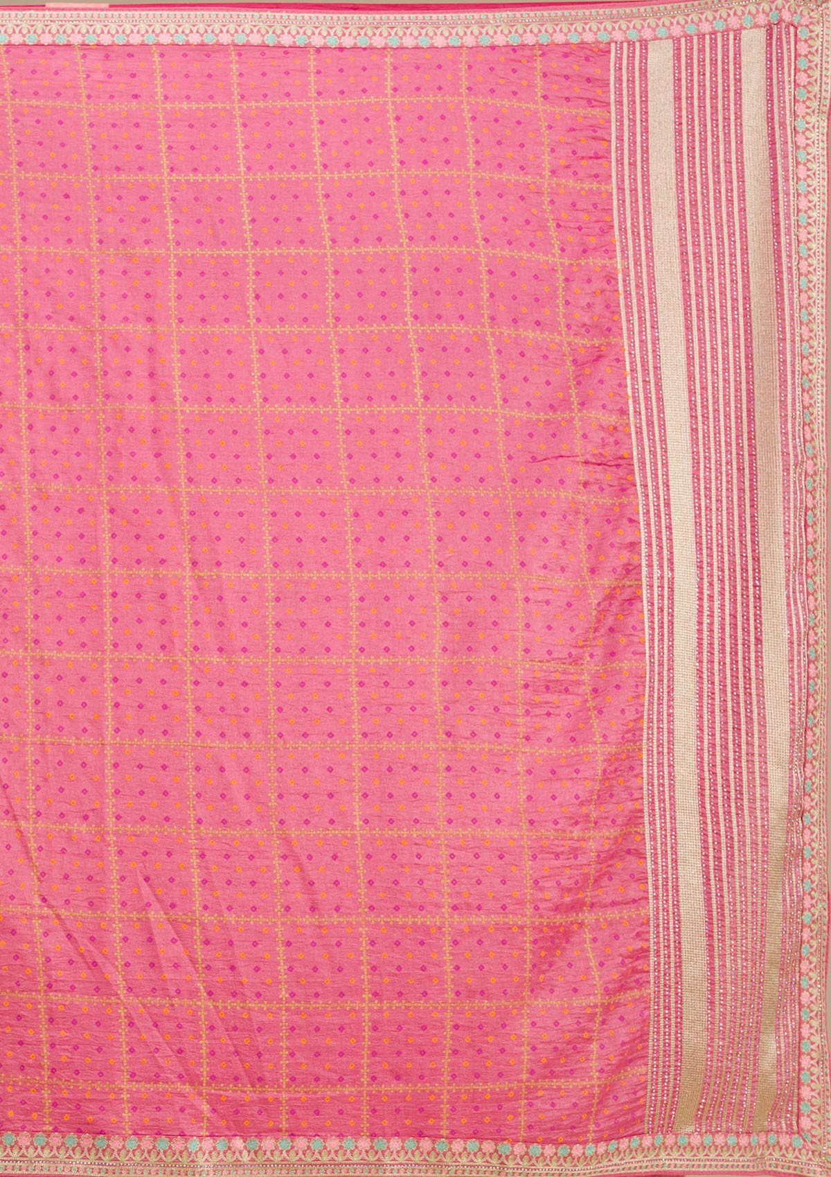 Dive into the world of vibrant elegance with Koskii's stunning pink saree, crafted from lusciously soft raw silk adorned with exquisite gold zariwork. This saree sparkles with a playful charm and a splash of radiant sophistication, making it an ideal statement piece for the discerning fashionista. Embrace your spirited side with this beautifully embroidered masterpiece that seamlessly blends tradition with a dash of contemporary zest.