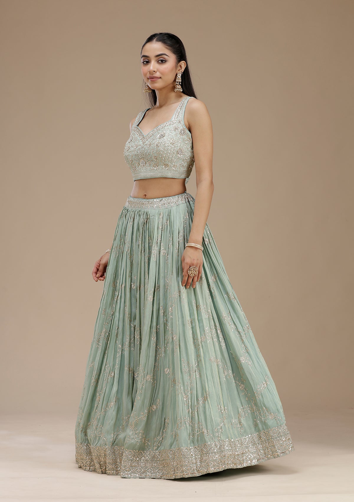 Pista Green Readymade Lehenga in Shimmer fabric. The Lehenga is embellished with Sequins embroidery. Accompanied with an Readymade blouse and dupatta. Comes with the Koskii promise of premium quality.