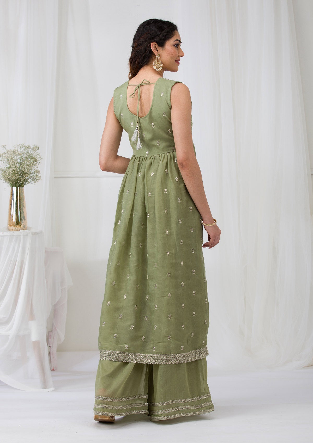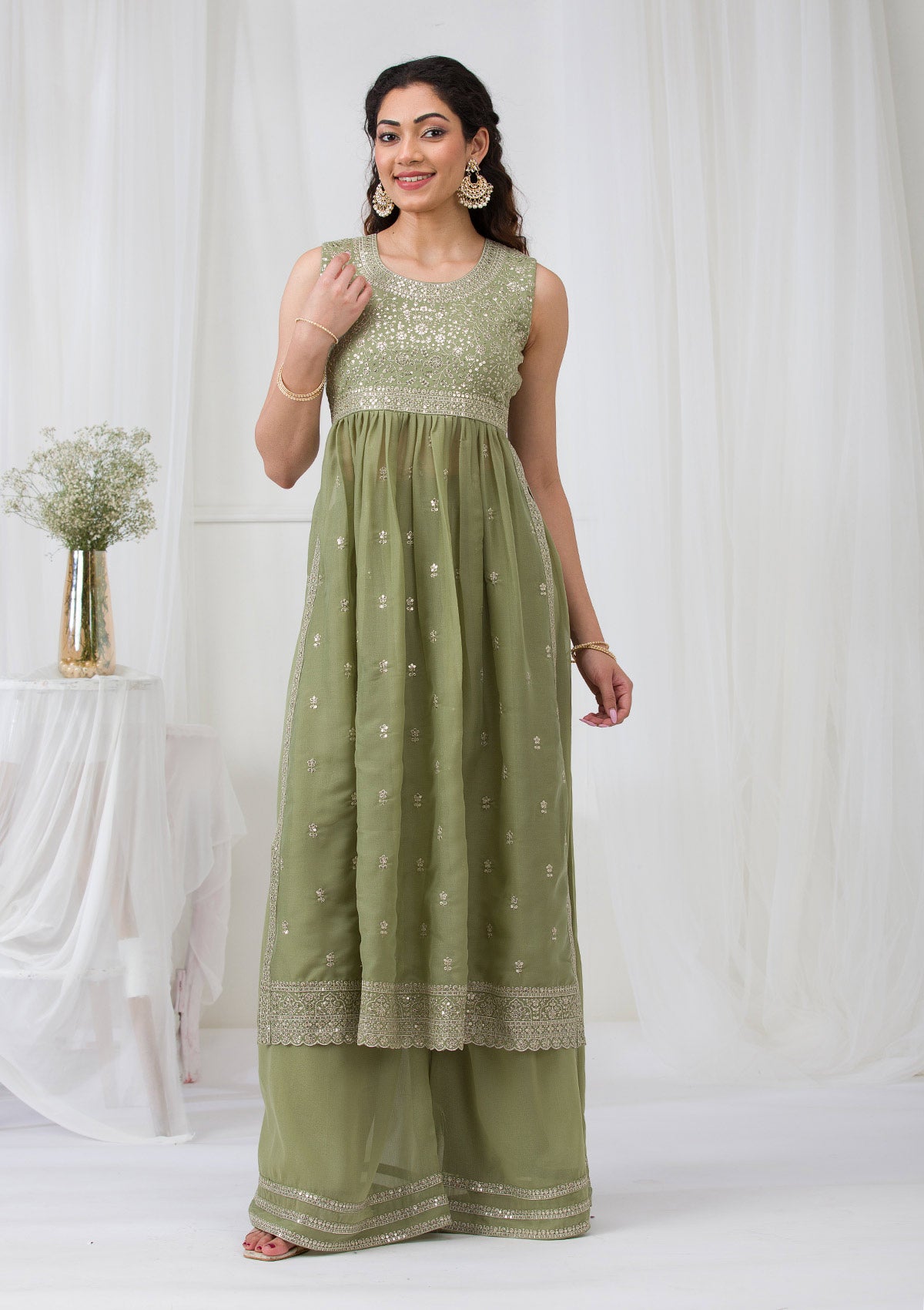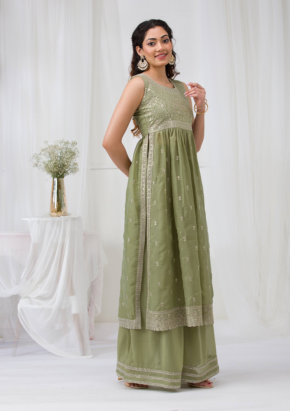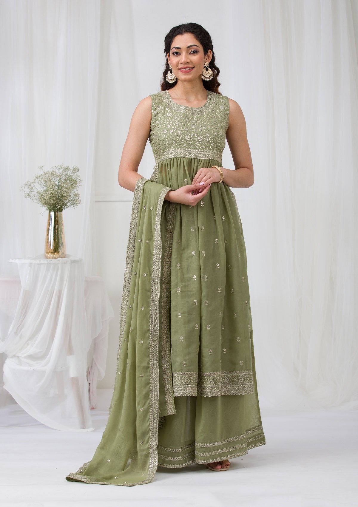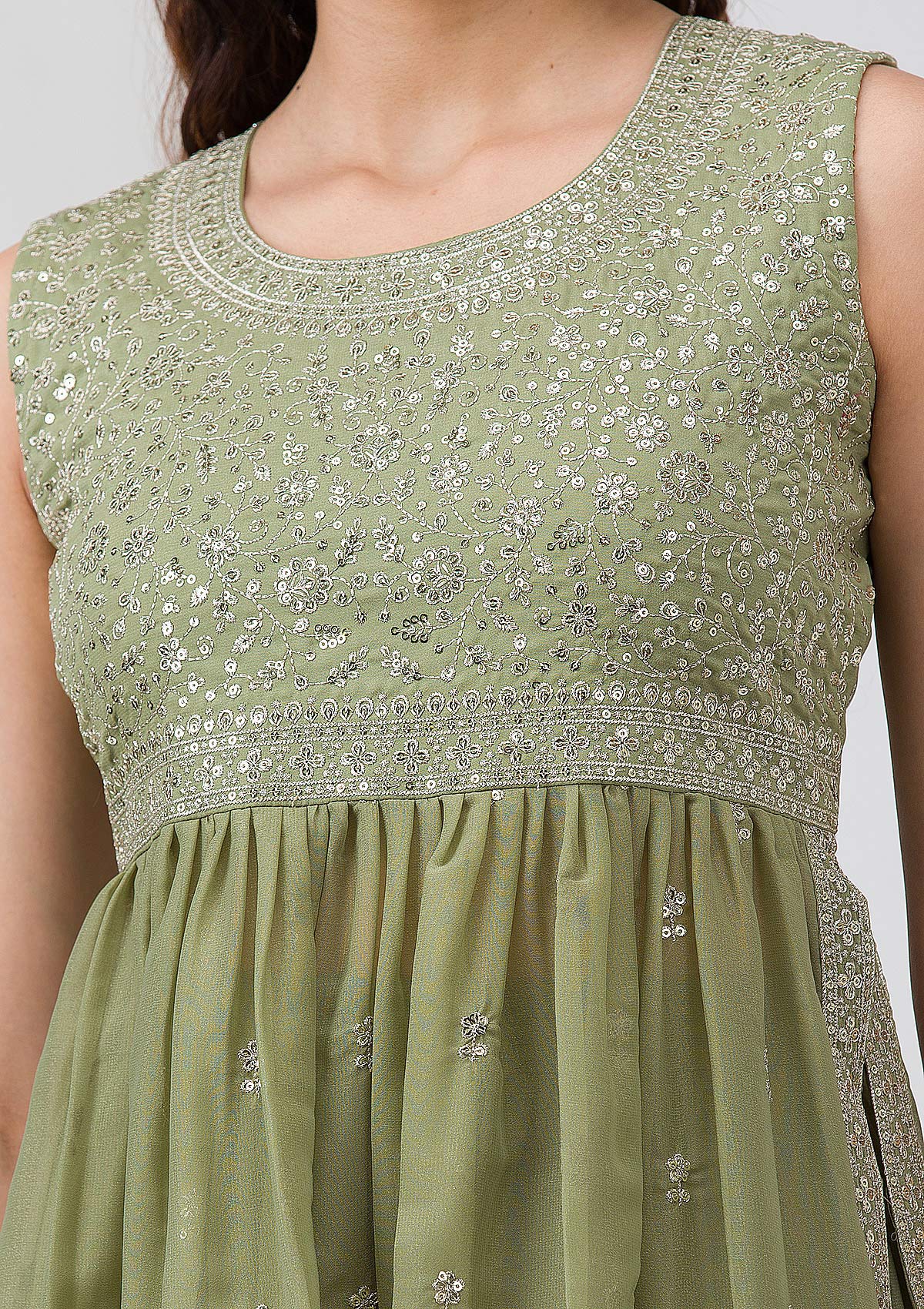 Dive into a world of majestic charm with Koskii's Olive Georgette Salwar Suit, a masterpiece adorned with radiant silver Zari embroidery that catches every flicker of light. Luxuriously crafted from the finest georgette fabric, this ready-to-wear ensemble promises a captivating silhouette and an unparalleled grace at every turn. Celebrate vibrant traditions with a modern twist in Koskii, where style meets sophistication!