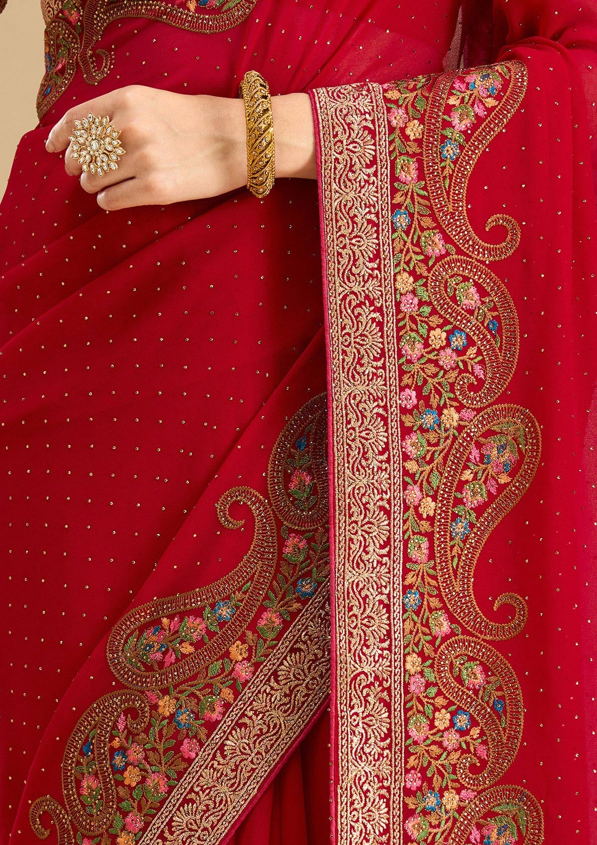 Rani Pink Saree in Georgette fabric The Saree is elevated with Kashmiri embroidery It comes with an Unstitched blouse Comes with the Koskii promise of premium quality.