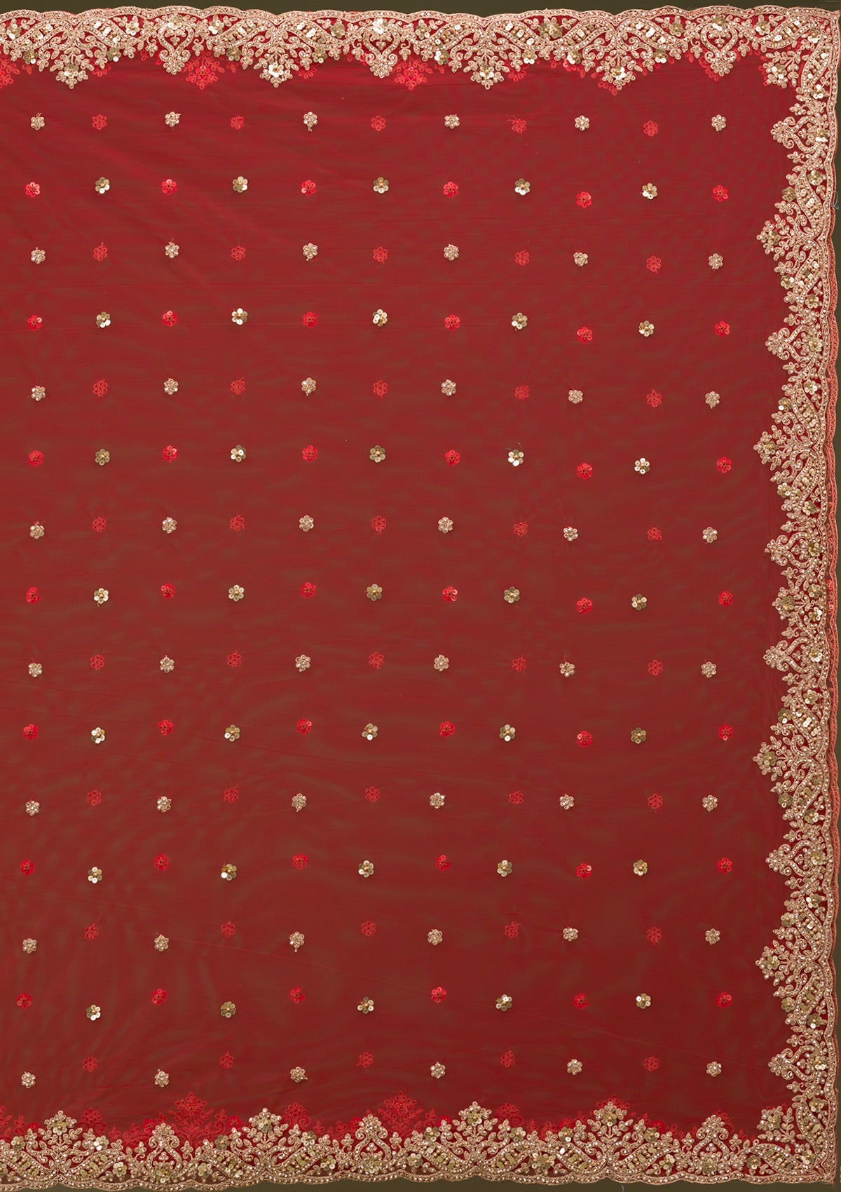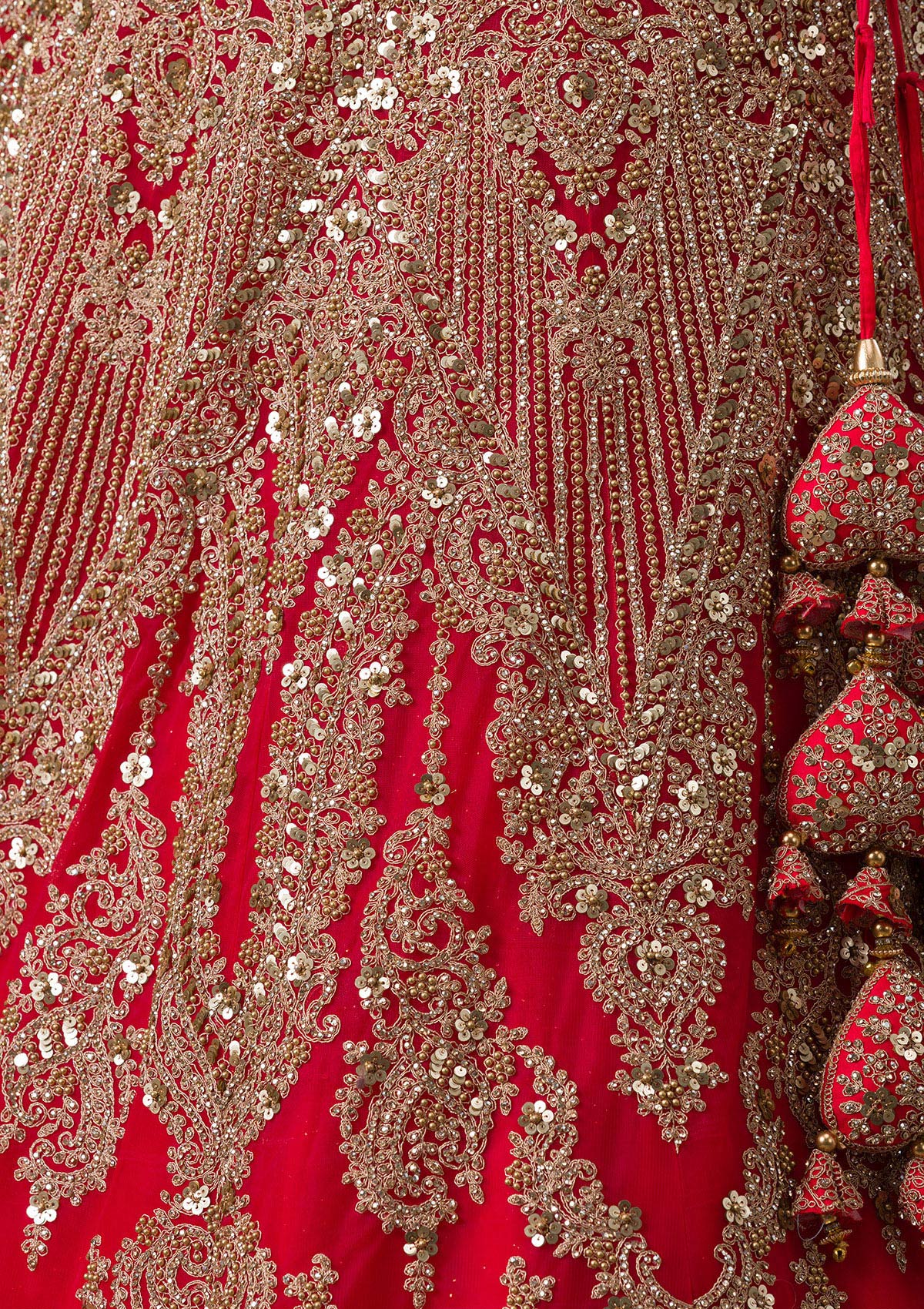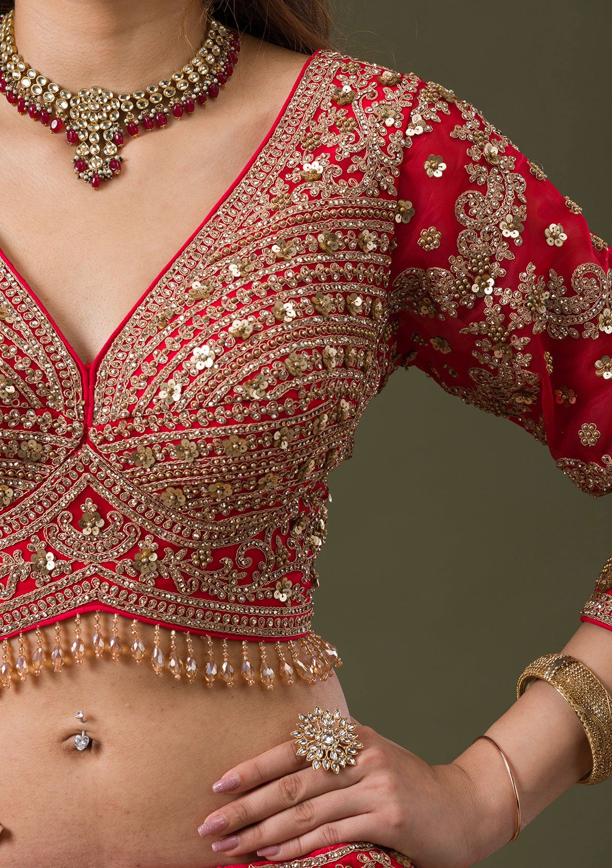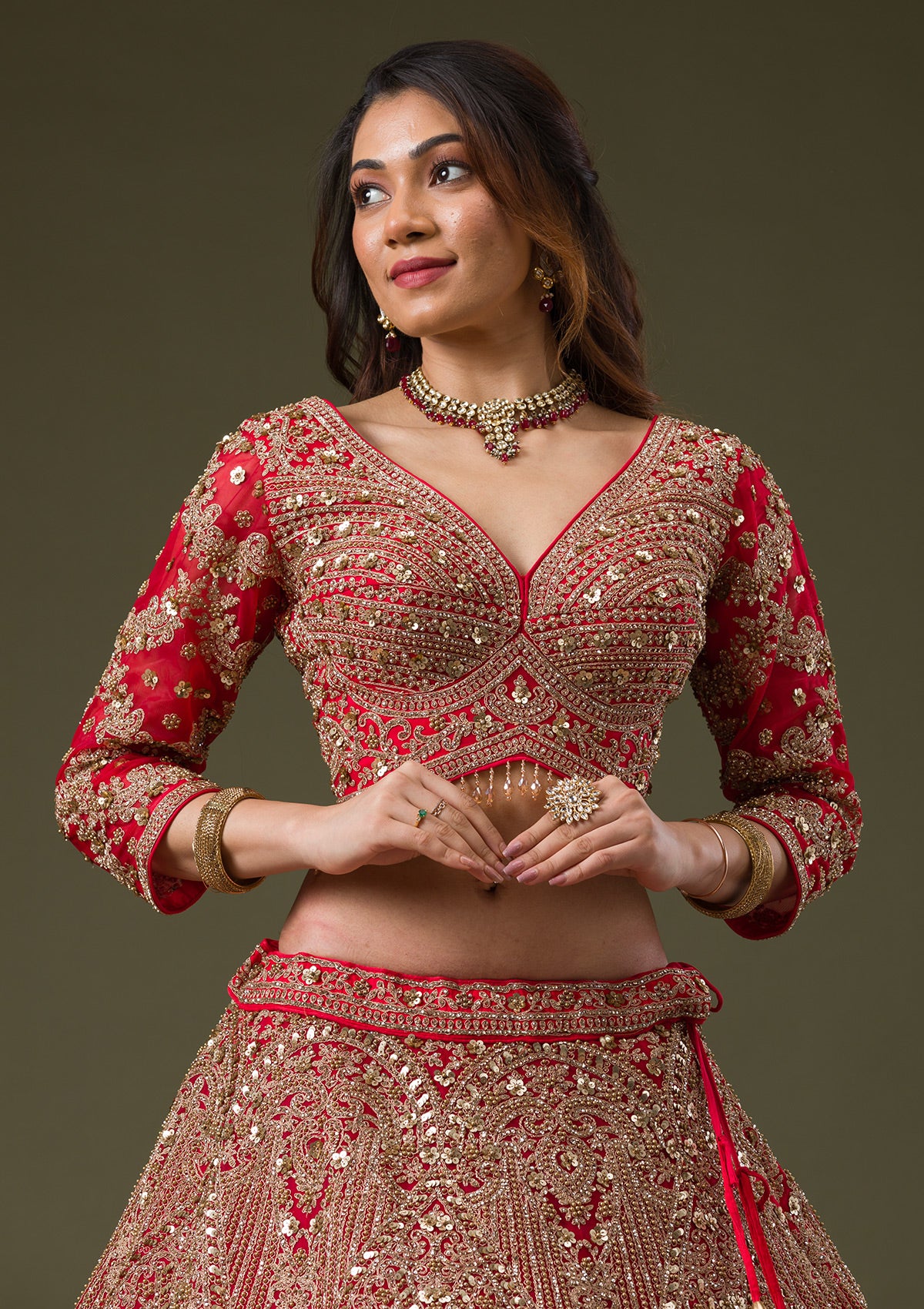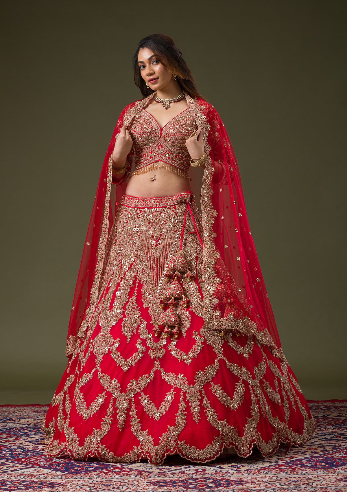 Dive into a world of enchantment with Koskii's vibrant red Net Lehenga, radiating the joy of celebration! This exquisite piece showcases meticulous zariwork embroidery that dances playfully across the fabric, reflecting a heritage of craftsmanship and the spirit of festive moments. Perfect for the bride who loves to sparkle, this lehenga combines timeless elegance with a modern twist for an unforgettable wedding day appearance.