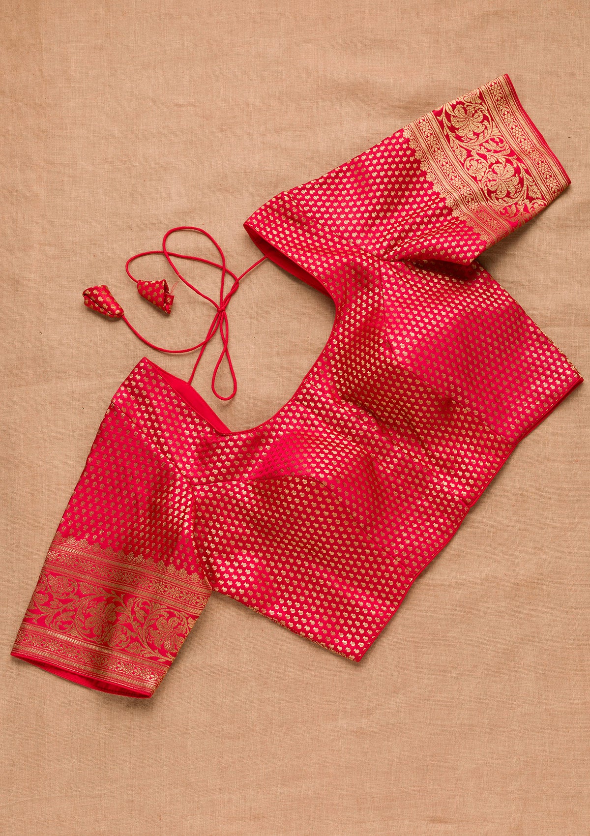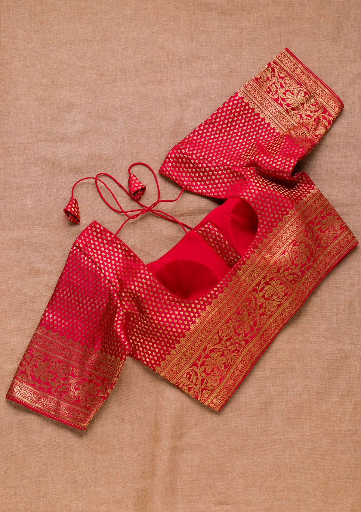 Red Ready to Wear Padded Blouse in Raw Silk fabric The Zariwork Blouse has a U Neckline Comes with the Koskii promise of premium quality.