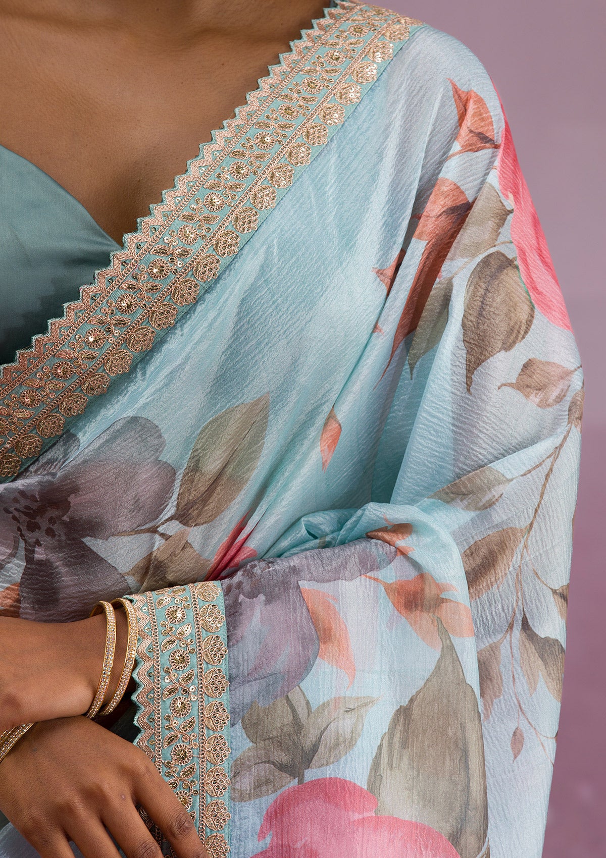 Sea Green Saree in Georgette fabric. The Saree is elevated with Printed embroidery. It comes with an Unstitched blouse. Comes with the Koskii promise of premium quality.