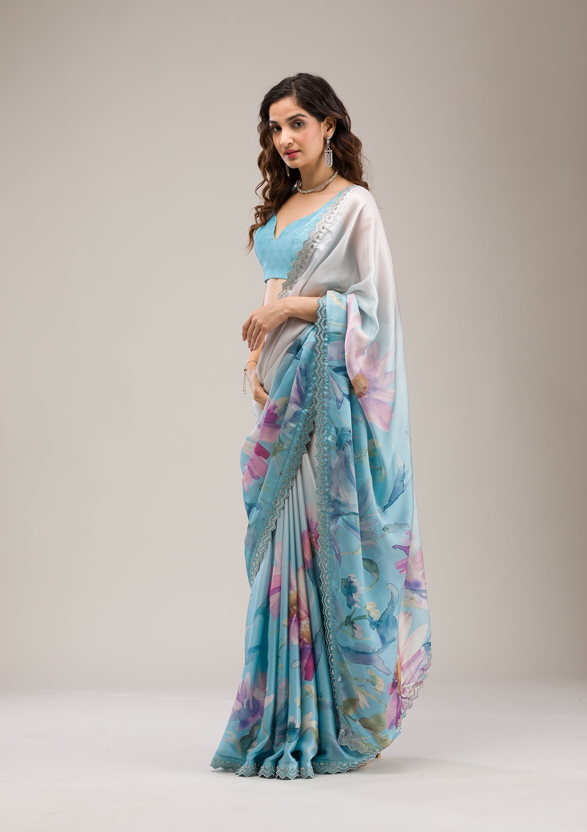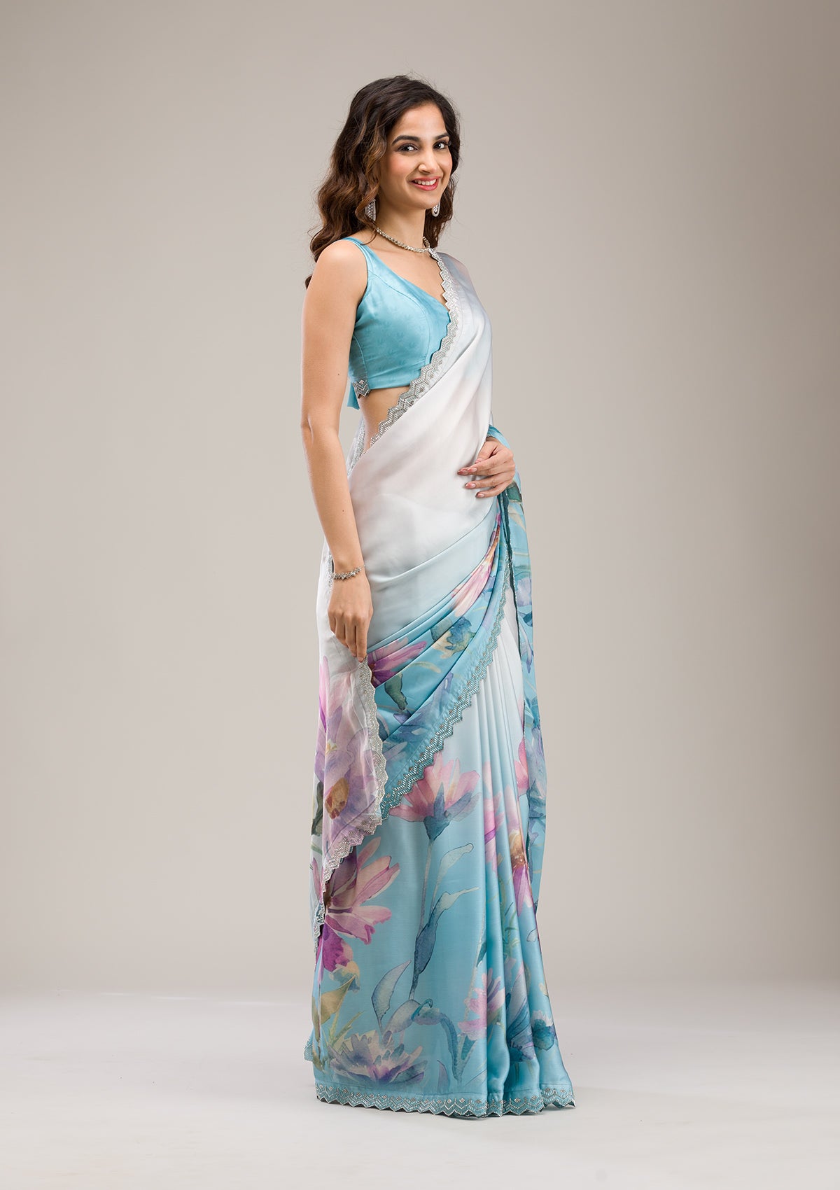 Sky Blue Saree in Satin fabric The Saree is elevated with Stonework embroidery It comes with an Unstitched blouse Comes with the Koskii promise of premium quality.