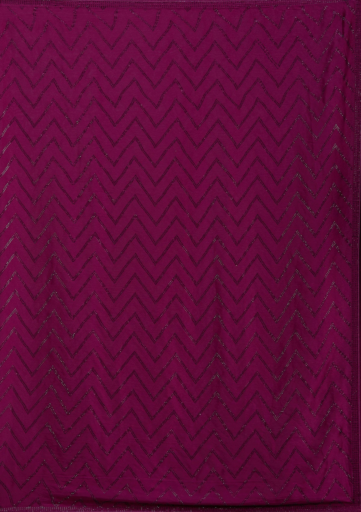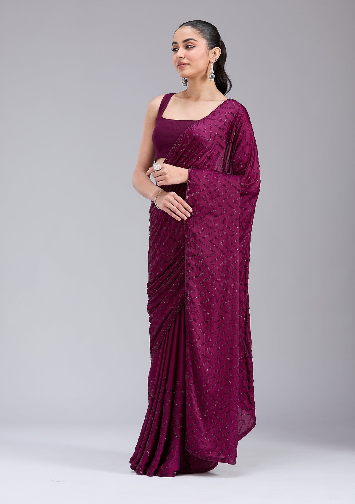Wine Saree in Organza fabric. The Saree is elevated with Stonework (Silver) embroidery. It comes with an Unstitched blouse. Comes with the Koskii promise of premium quality.