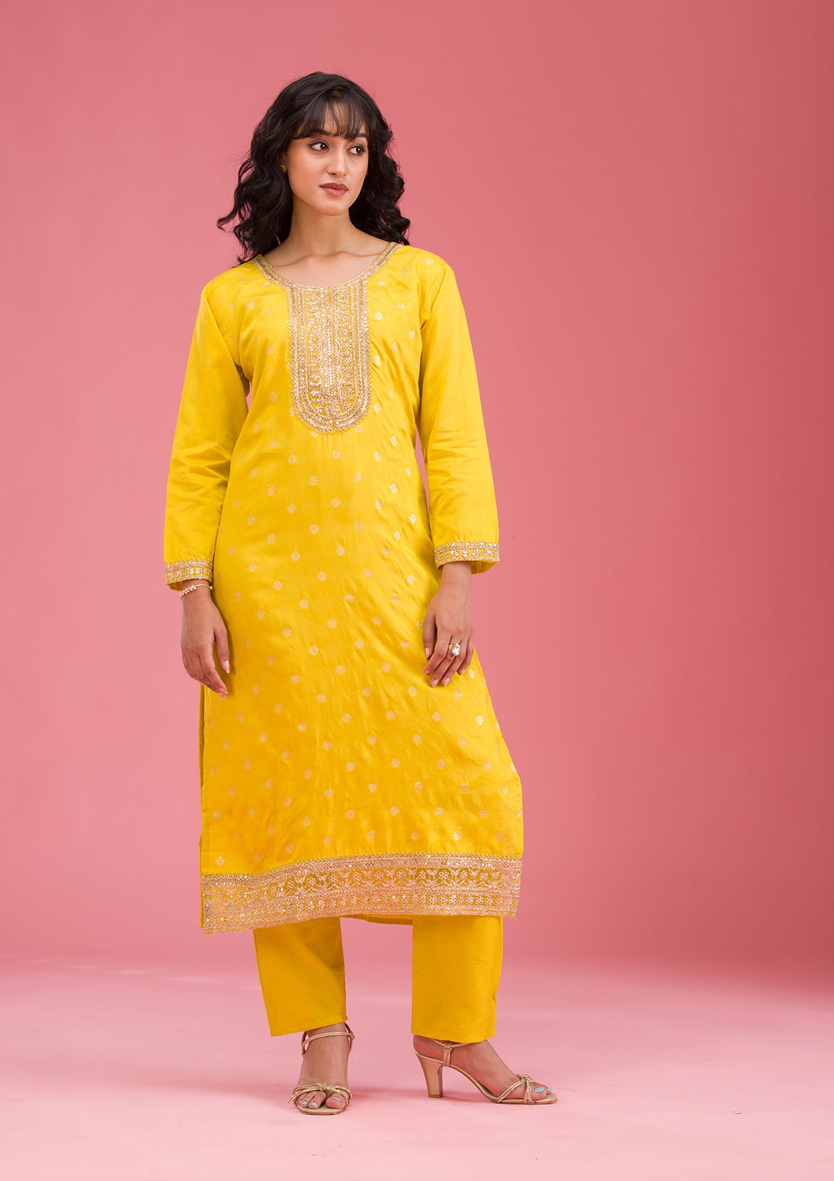 Yellow Salwar_RM in Chanderi fabric. The Salwar_RM is embellished with Cording embroidery. Accompanied with a bottom and dupatta. Comes with the Koskii promise of premium quality.